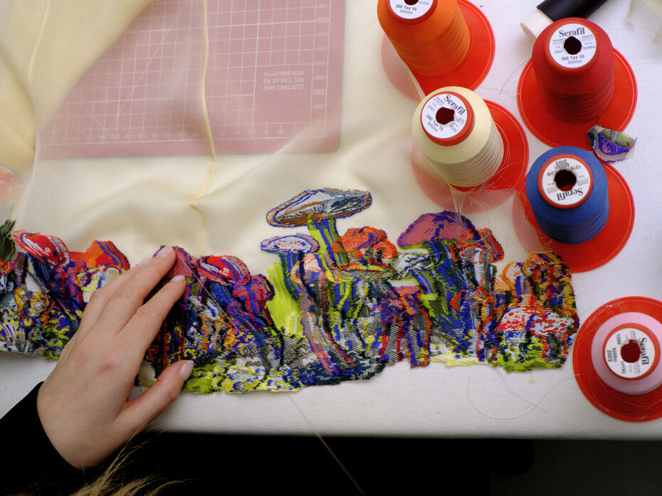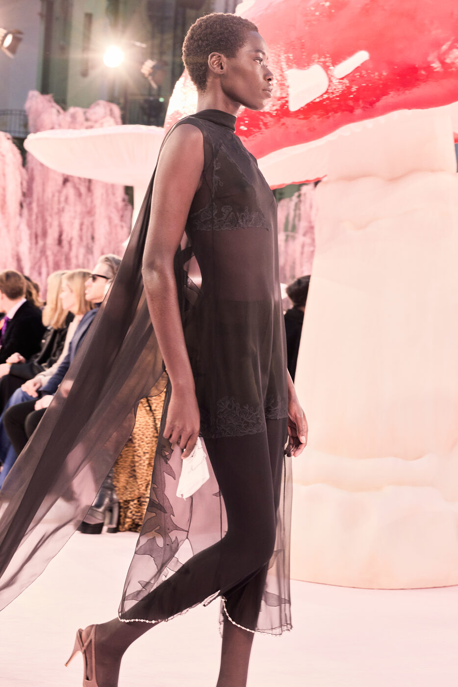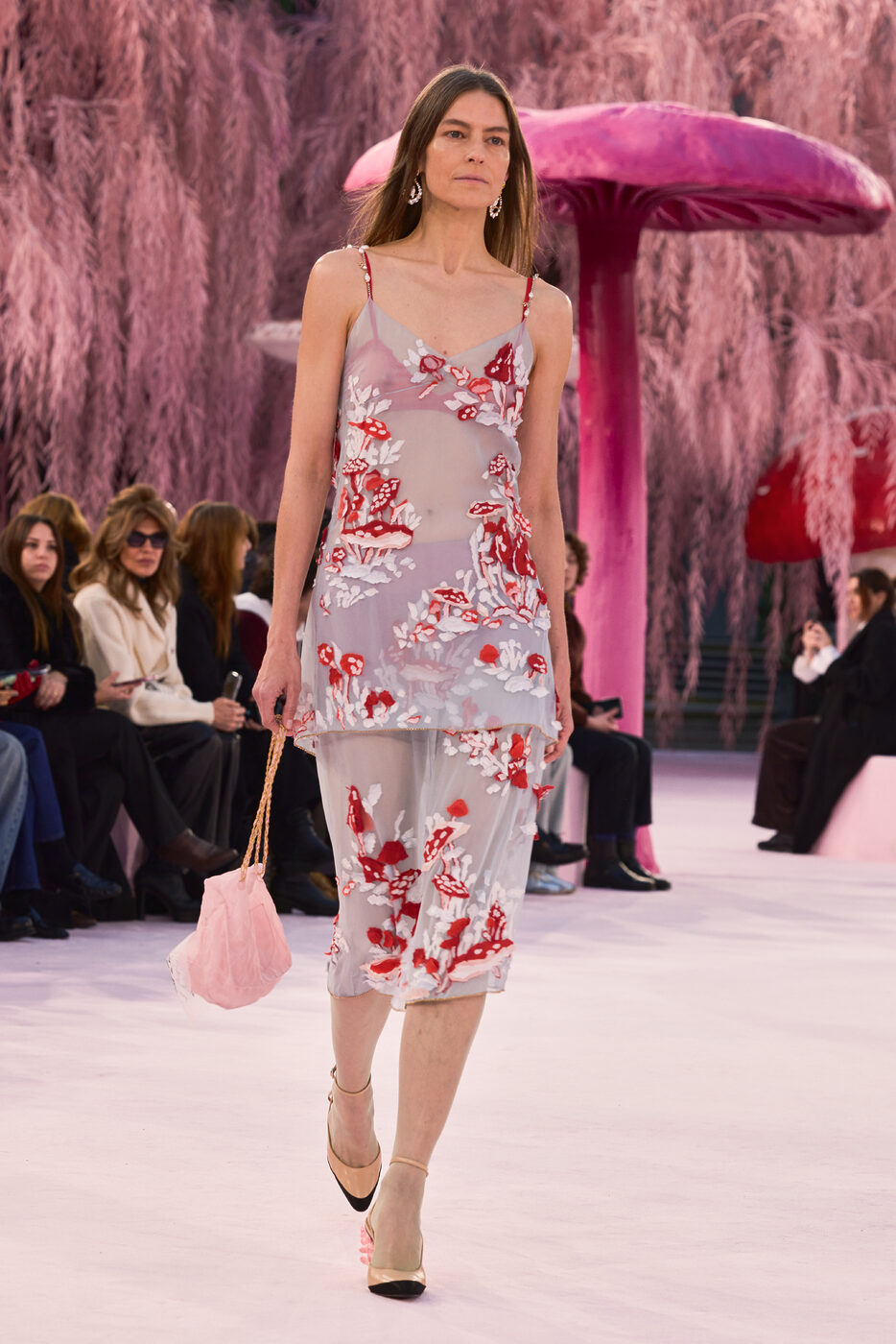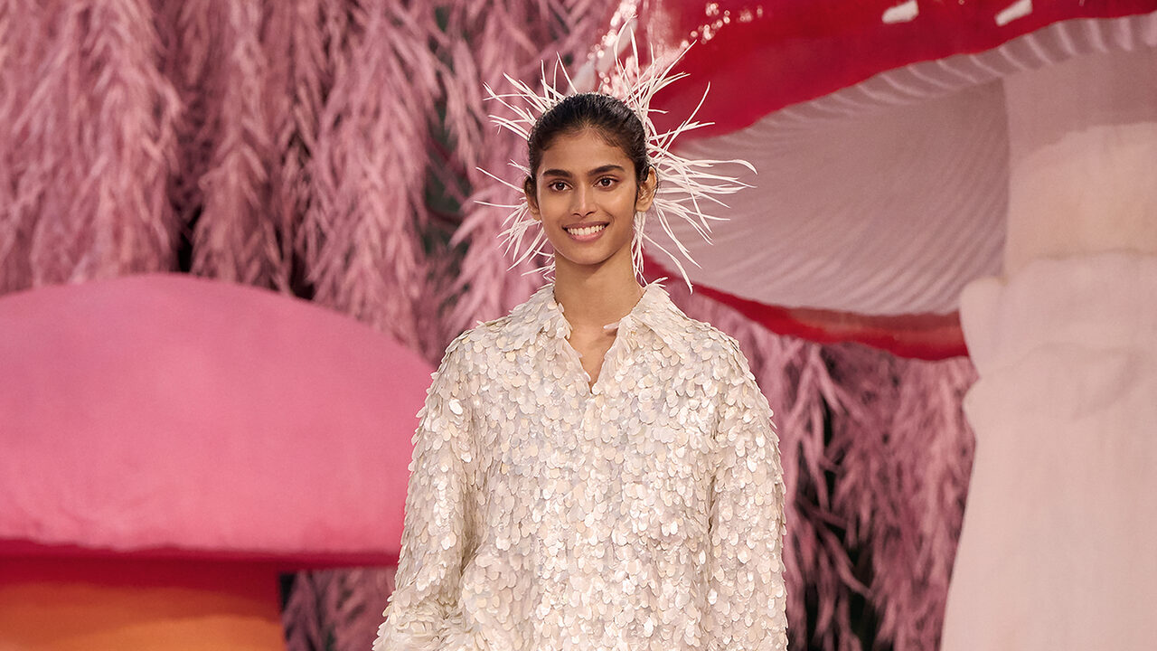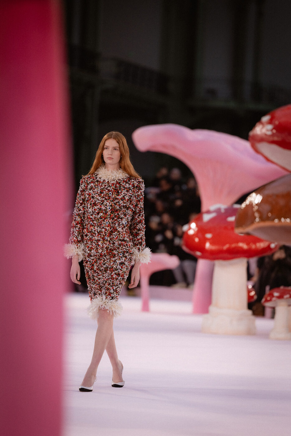 샤넬의 베뉴인 그랑 팔레는 마법의 숲으로 변모했다. 연분홍으로 채색된 바닥에 붉은색, 분홍색, 노란색의 대형 버섯과 버드나무가 설치되어 동화처럼 신비로운 분위기를 연출했다. 런웨이는 숲속의 오솔길처럼 나선형으로 배치됐다. 자연에서 버섯은 죽은 것을 분해해 새로운 생명을 키우는 존재다. 마티유 블라지는 버섯이라는 상징을 통해 전통을 해체하고 다시 세우는 자신의 창조적 태도를 은유적으로 드러냈다.
