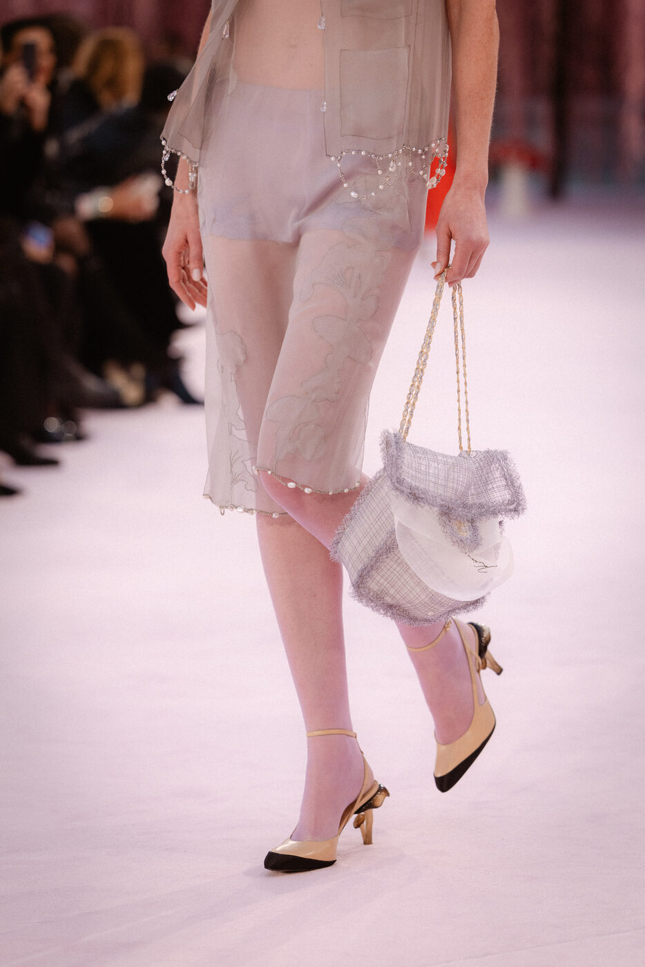 이번 컬렉션에서 샤넬의 아이코닉 액세서리는 섬세한 방식으로 현대화됐다. 클래식 플랩 백은 투명한 실크 모슬린 소재로 재해석됐는데, 특히 가방 내부에 숨겨진 러브레터 자수가 시선을 사로잡았다. 이는 코코 샤넬이 연인에게서 받은 편지를 숨기기 위해 플랩 백 안쪽 지퍼 포켓을 만들었다는 일화에서 출발한 디테일로, 마티유 블라지는 이를 ‘감정적인 유물’이라는 개념으로 확장했다. 브랜드의 역사적 서사를 착용자 개인의 친밀한 기억과 연결하는 흥미로운 시도다. 슈즈 역시 전통적인 투톤 토 캡을 기반으로 슬링백, 펌프스, 건축적 실루엣의 삭스 힐까지 폭넓게 변주됐다. 특히 버섯 형태에서 영감을 받은 초현실주의적 힐 디자인은 굽 자체를 하나의 조형 오브제로 끌어올리며, 슈즈를 단순한 액세서리 이상의 존재로 격상시켰다.