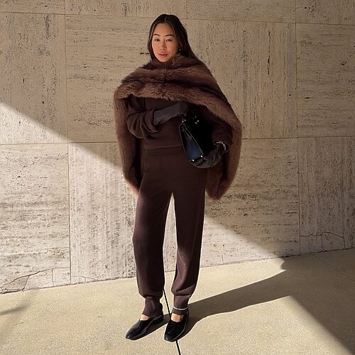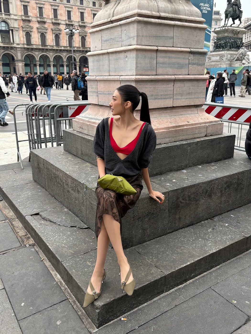 한국에도 이 유행에 발빠르게 도전한 용감한 여인이 있었으니! 바로 미야오 가원입니다. 지난 1월 프라다 맨즈 컬렉션에 참석한 그녀는 깊게 파인 회색 니트 톱에 빨간 브라를 레이어드에 포인트를 더했죠. ‘기본템’으로 여겨지는 회색 V넥 니트톱이 네크라인에만 변주를 주었을 뿐인데 세상 도발적인 아이템이 되었습니다. 여기에 시스루 소재 펜슬 스커트를 매치해 모델 뺨치는 비율을 가진 가원의 매력을 가장 잘 보여주는 룩이었습니다.