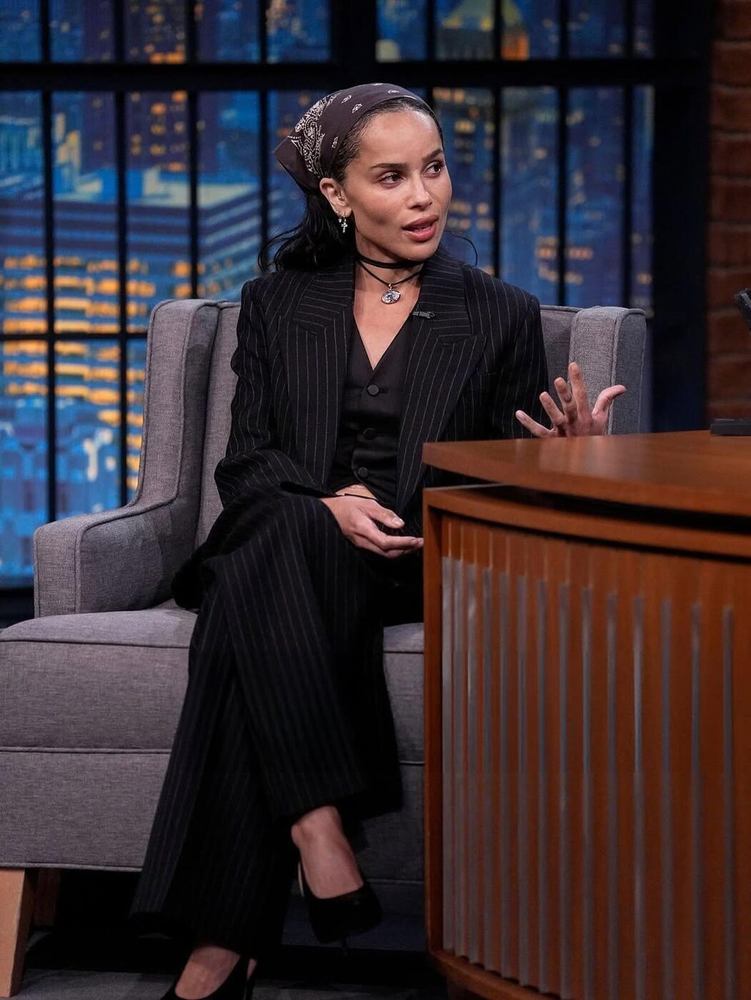 헤어 액세서리를 좋아하는 조 크라비츠는 겨울엔 캐시미어 스카프를, 여름에는 반다나를 즐겨 쓰곤 하는데요. 한 토크쇼에서는 멀끔한 스트라이프 슈트 셋업에 동일한 네이비 색상의 반다나를 둘러 이색적인 슈트 룩을 선보였습니다. 또 다른 스케줄에서는 붉은 카디건에 초록 반다나를 써 과감한 컬러 믹스매치 룩을 선보였는데요. 미니멀한 스타일링에 포인트 컬러를 잘 활용하는 센스로 화사한 옷차림을 완성했죠. 한편 군더더기 없이 평범한 데일리 룩에도 푸른 민트 컬러 반다나를 더해 그녀 특유의 쿨함을 드러내기도 했습니다.