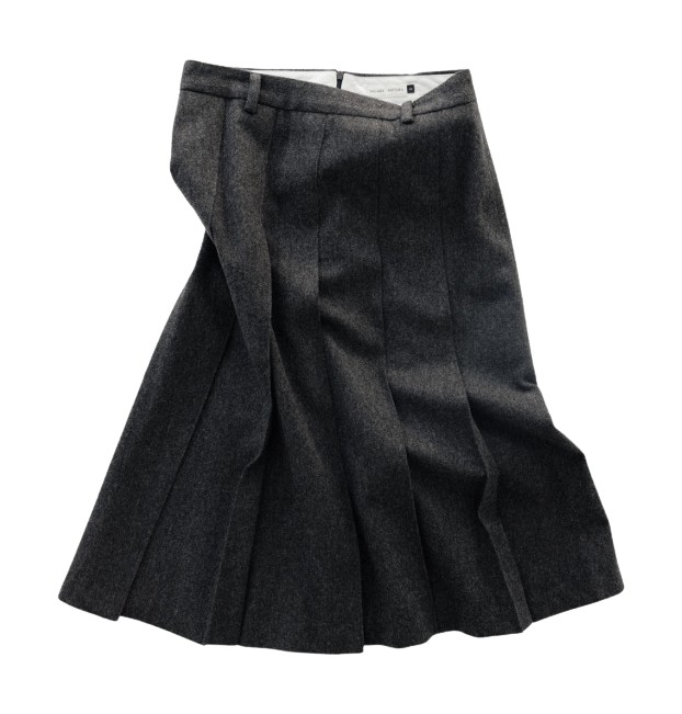 마치 포멀한 정장을 입듯, 진회색의 재킷과 플리츠 스커트 룩은 그 자체로 단정한 카리스마가 느껴집니다. 톤이 다른 타이즈와 니트 비니로 포인트를 준 룩에는 새빨간 스웨터를 허리에 둘러 잿빛 룩에 강렬한 포인트를 더했어요.
