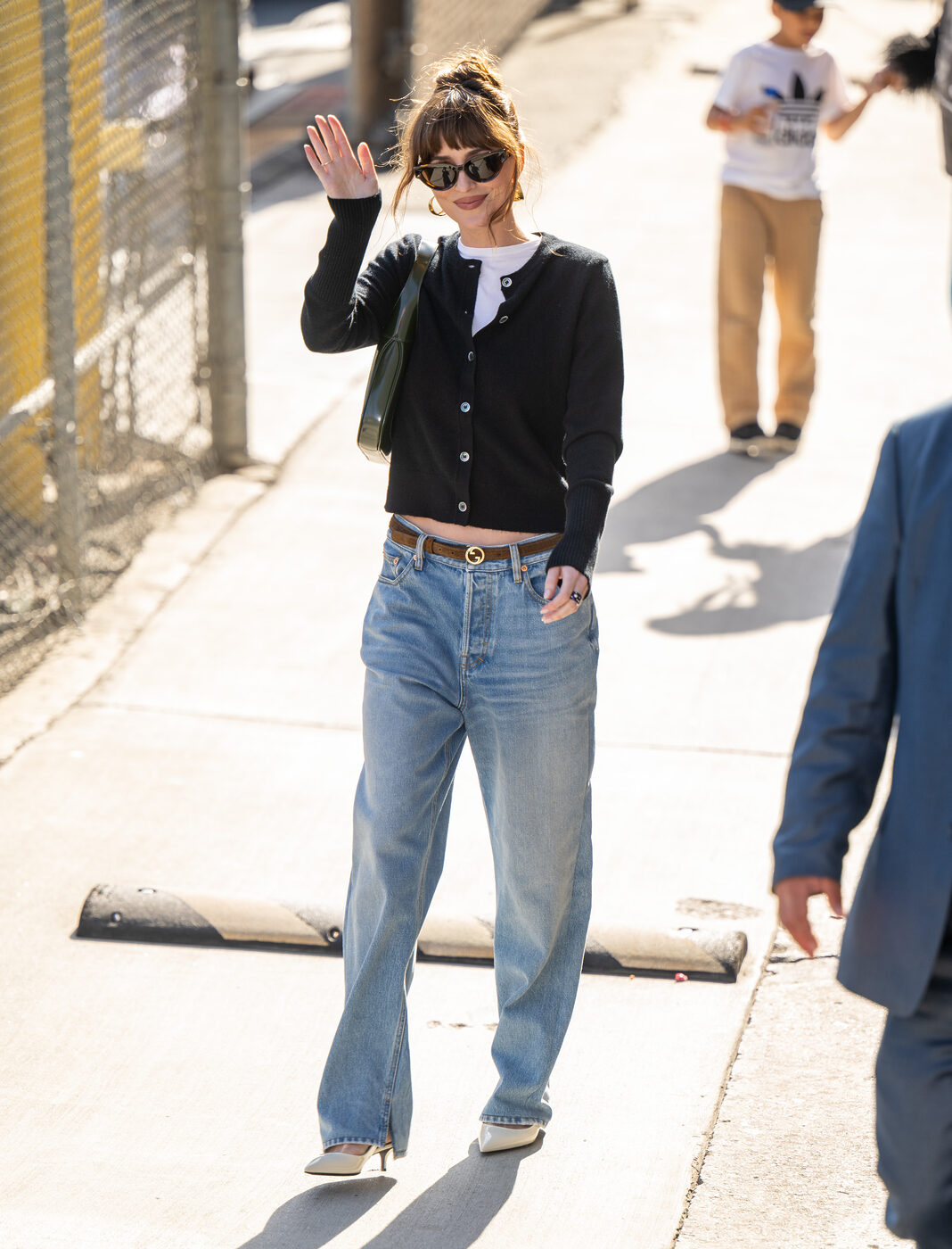 따라 입고 싶어지는 다코타 존슨의 데일리 룩에는 현실적인 매력이 담겨있습니다. U넥 카디건이나 쿼터 집업처럼 활용도 높은 베이식 아이템에 넓은 통의 배기 데님을 매치해 누구나 일상에서 참고하기 좋은 스타일을 완성하죠. 여기에 그녀처럼 스틸레토 힐을 더한다면 데일리 룩은 물론 세련된 오피스 룩으로도 손색없답니다.