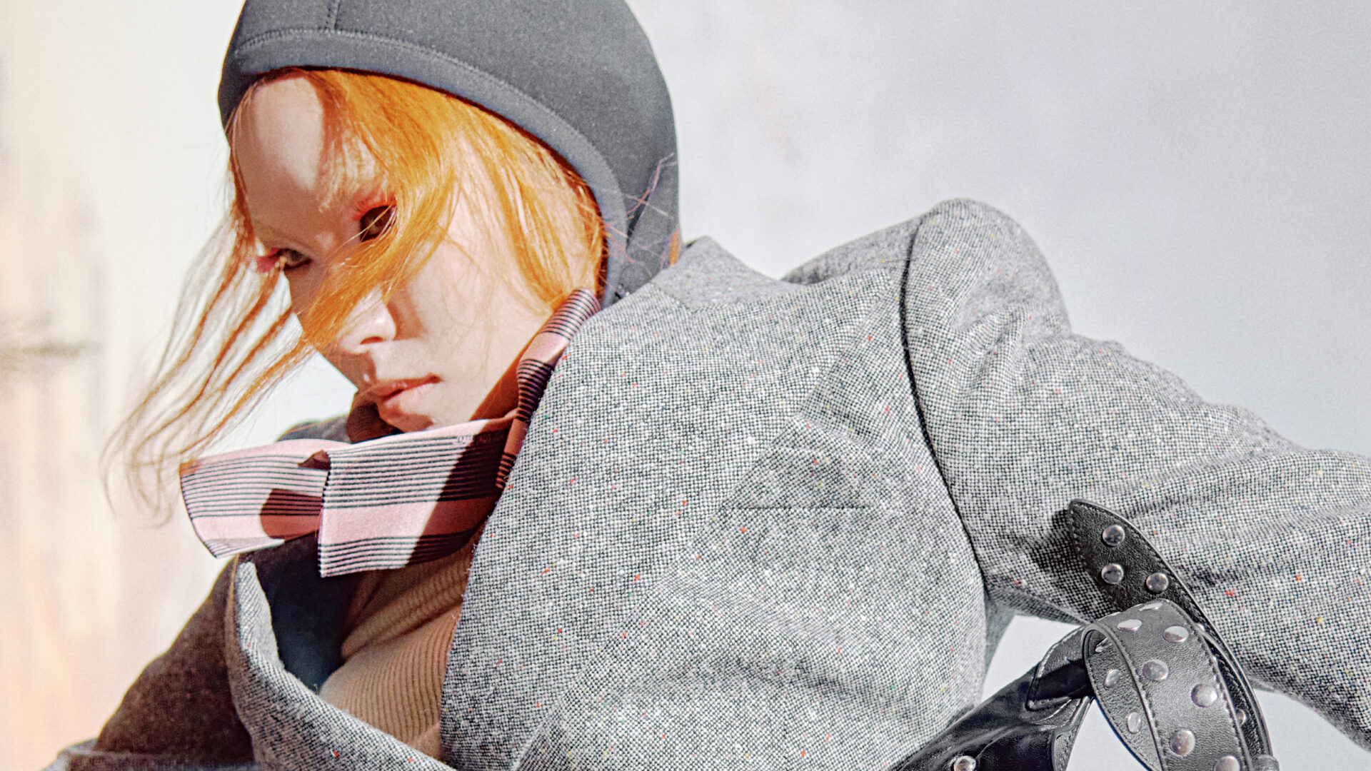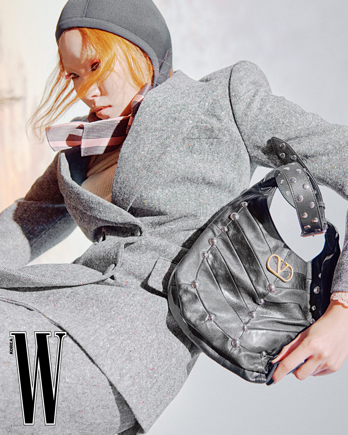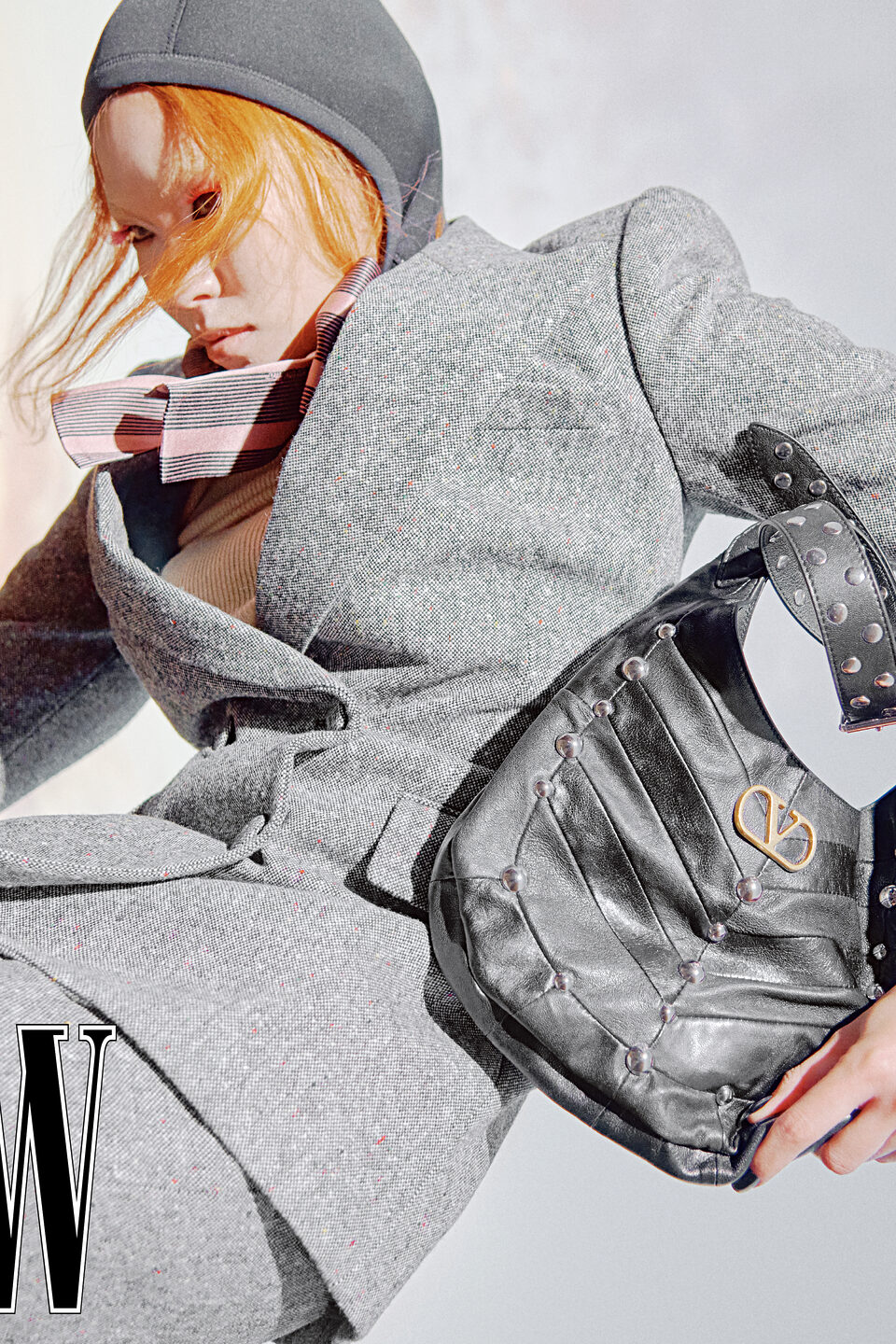 저지 후디는 76만원, 슈트 재킷은 6백10만원, 분홍 셔츠는 4백40만원, 니트는 가격 미정, 슈트 팬츠는 2백65만원, 스터드 장식 숄더백은 3백73만원으로 발렌티노 제품.
