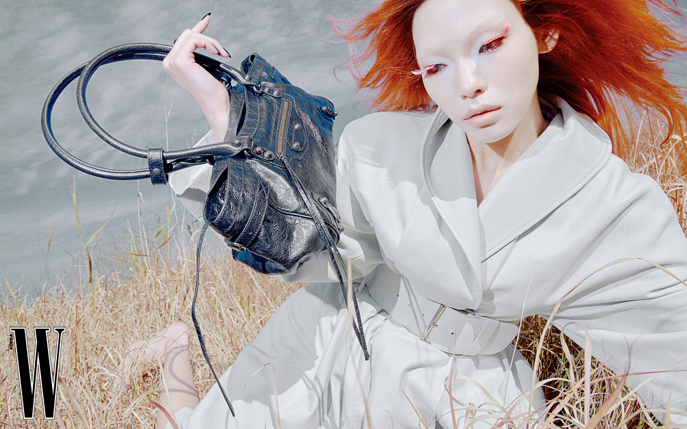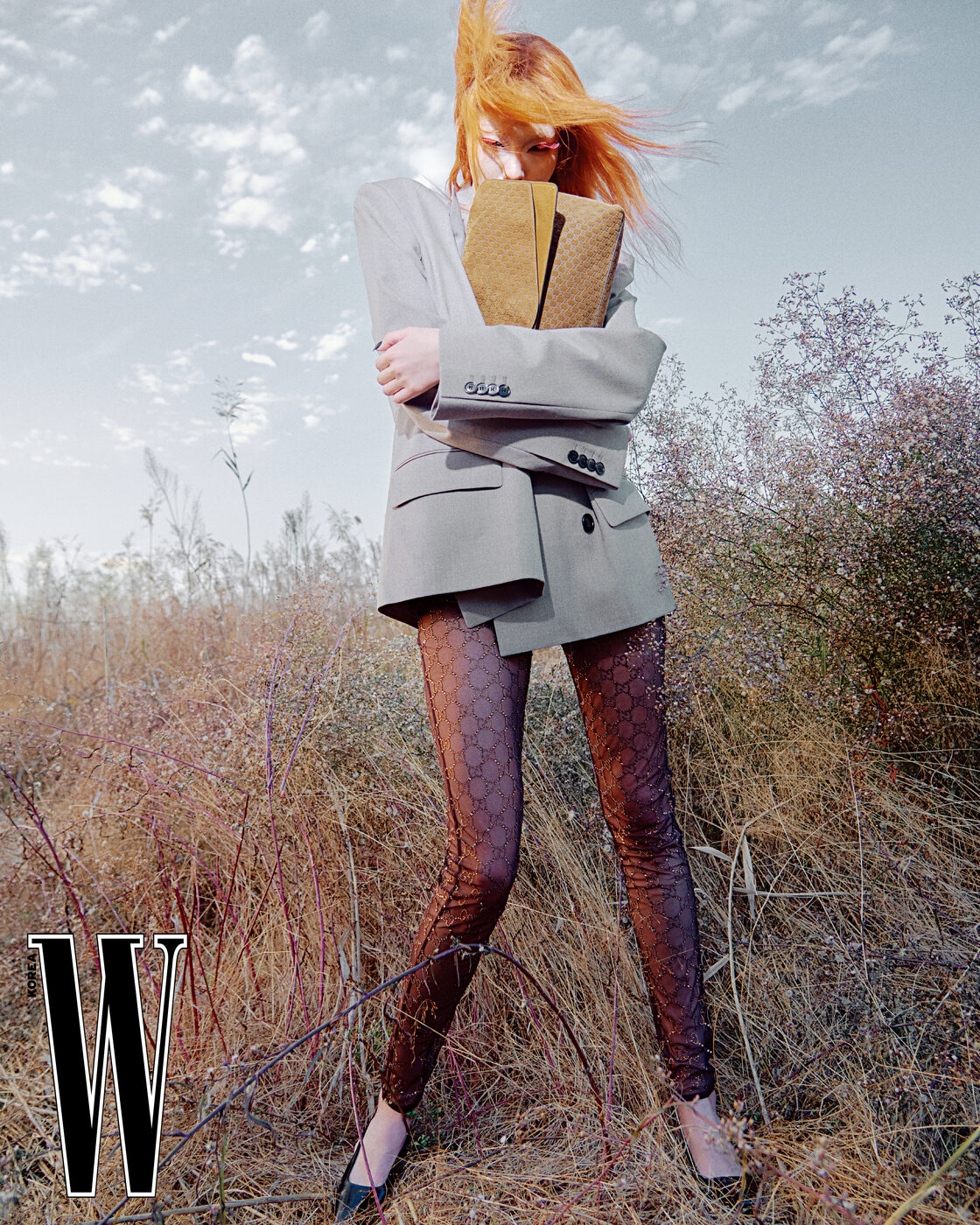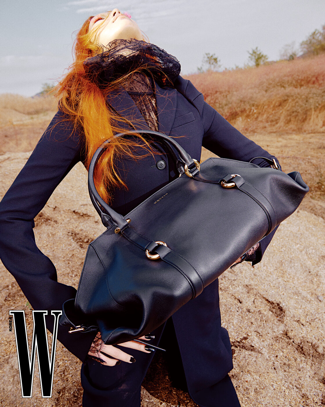 드라마틱한 시스루 톱은 2백8만원, 재킷은 5백32만원, 팬츠는 2백8만원, 백은 4백3만원으로 맥퀸 제품.
