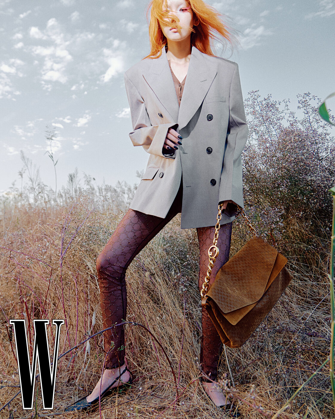 큼직한 재킷은 6백10만원, 버튼 톱은 2백95만원, 큐빅 장식 레깅스는 7백90만원, 터프한 체인 백은 6백만원, 슈즈는 1백77만원으로 구찌 제품.