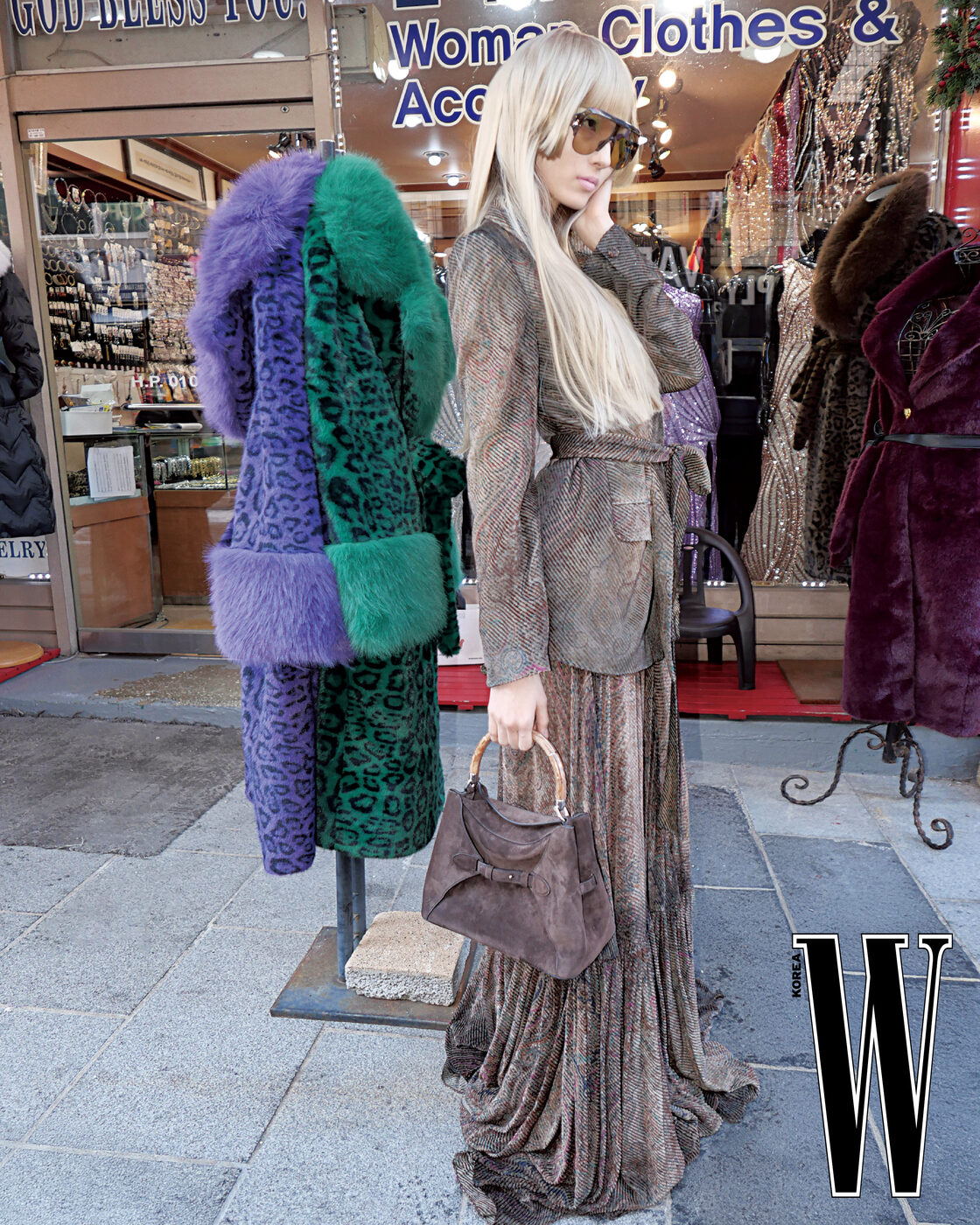 보잉 선글라스는 Gucci, 페이즐리 벨벳 셔츠, 맥시스커트, 스웨이드 탑핸들백은 Ralph Lauren Collection 제품.