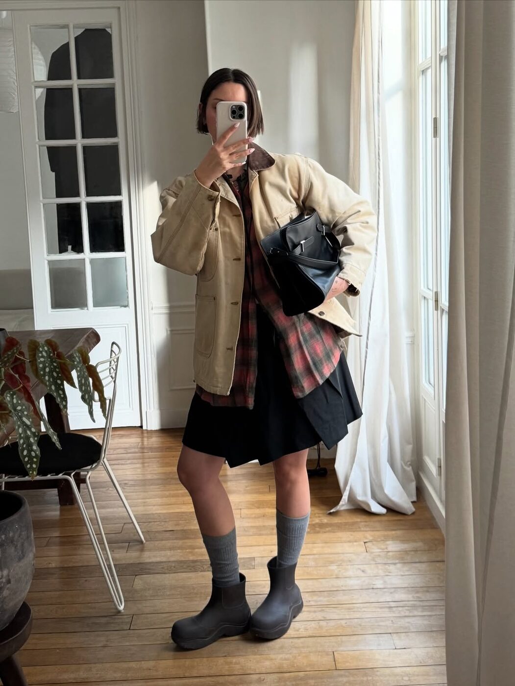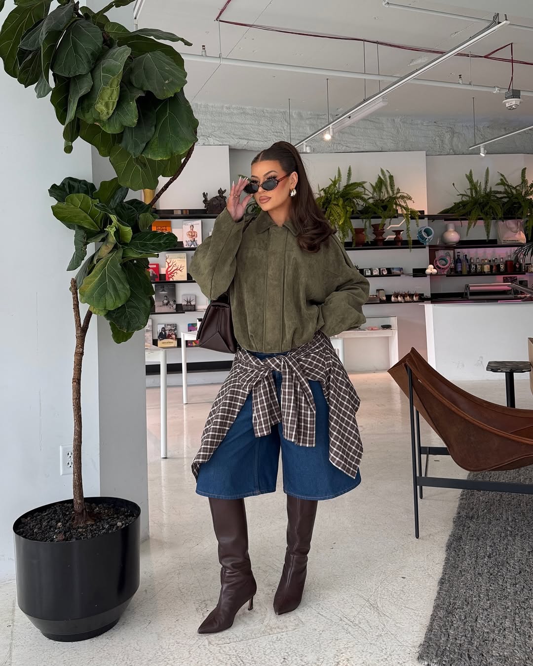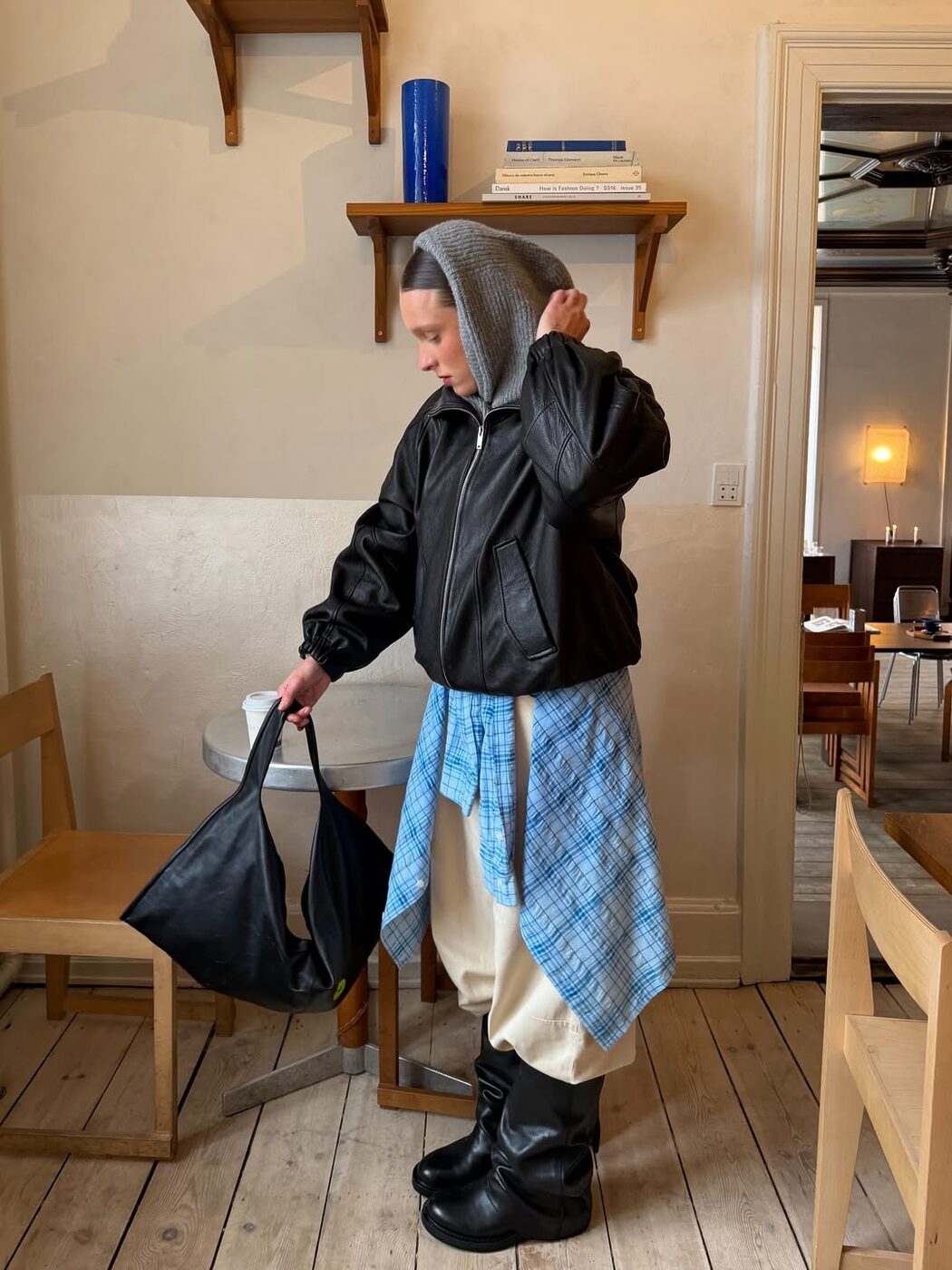 캐주얼한 팬츠 위 체크 셔츠를 허리에 묶고, 그 위에 바머 재킷을 매치한 스타일링도 눈에 띕니다. 상하의 모두 투박한 오버사이즈 제품을 선택해 전체적인 실루엣에는 여유를 주는 것도 중요합니다. 단순한 이 조합에는 셔츠를 넓게 펼쳐 스커트처럼 면적감이 느껴지도록 둘러보세요. 볼륨감 있는 바머 재킷이 상의에 힘을 실어주는 동시에 허리에 질끈 묶은 체크 셔츠가 감초 역할을 톡톡히 해줄 거예요.