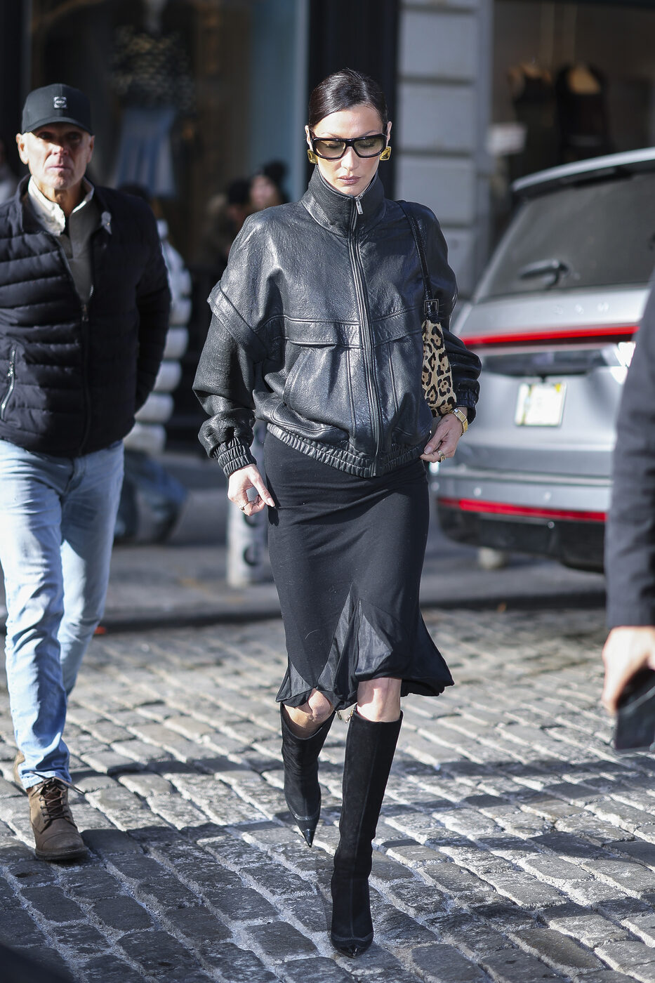 벨라 하디드의 소울메이트도 이 가죽 재킷이죠. 그의 스타일링에서도 역시 찾아볼 수 있는 하이넥 디테일! 보머 재킷 형태의 가죽 재킷을 지퍼까지 딱 올려서, 거의 목을 감싸듯 입었습니다. 머리는 슬릭하게 올백으로 넘기고, 골드 이어링으로 힘을 주면서 전체적인 룩을 굉장히 시크하게 연출했네요. 딱 붙는 스커트랑 뾰족한 토의 부츠도 물론 한몫을 하지만, 그럼에도 포인트는 하이넥입니다. 목이 올라오니까 다른 디테일들이 없어도 충분히 스타일리시해 보이는거죠.