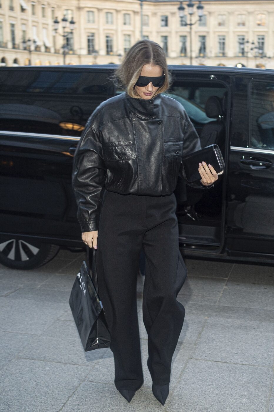 로지 헌팅턴 휘틀리의 찐 애착템인 가죽 재킷입니다. 보면 알겠지만 목 끝까지 단추를 채워 하이넥으로 입죠. 올블랙으로 입어도, 블랙 앤 화이트로 매치해도 깃을 잔뜩 올린 하이넥 디테일 덕분에 훨씬 멋스러워 보입니다. 보온성까지 챙길 수 있는 건 덤이고요. 머리를 풀었을 때는 더 로우 자매들처럼 아우터 안으로 머리를 살짝 넣어 연출하면 더욱 시크해집니다.