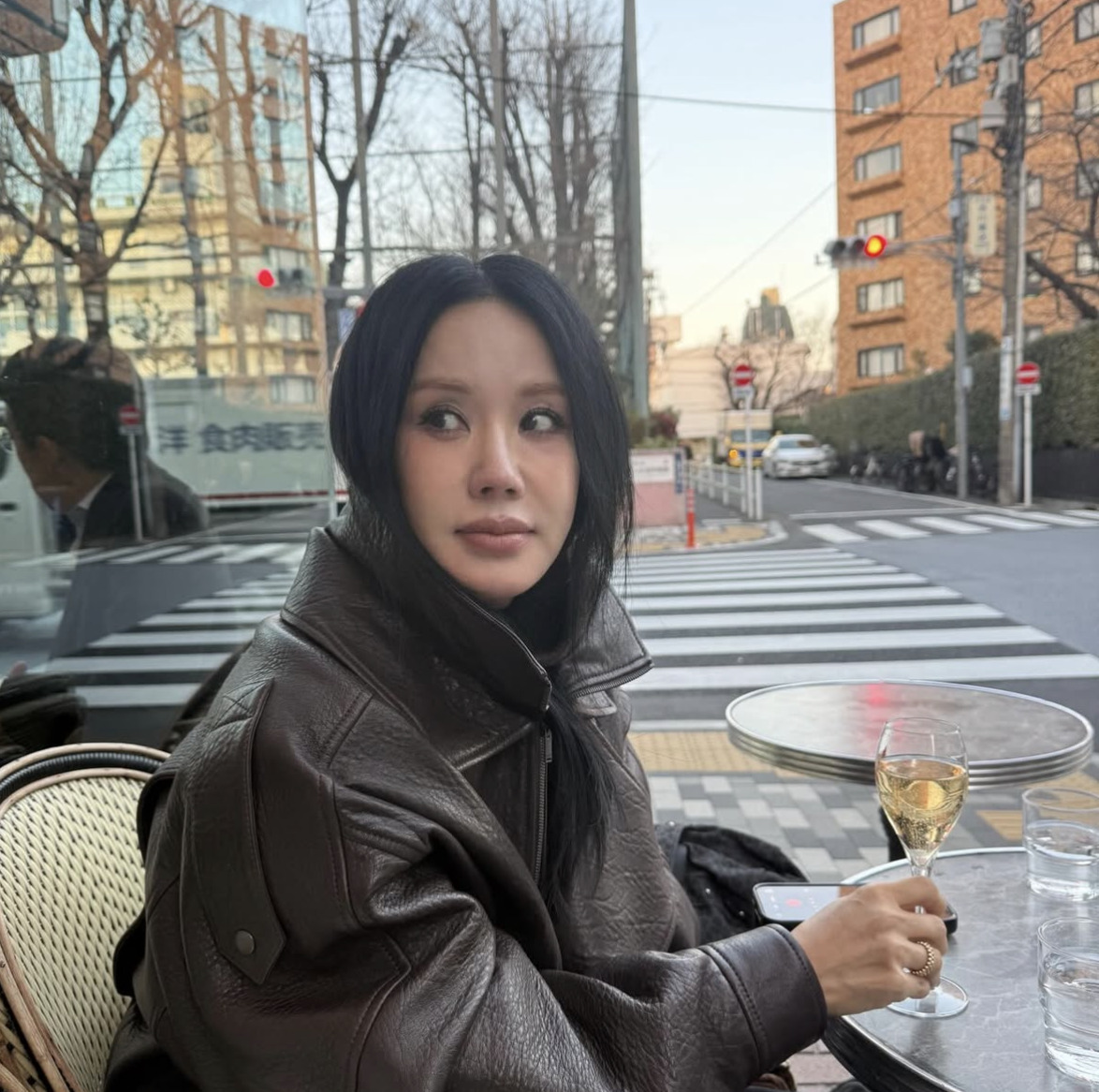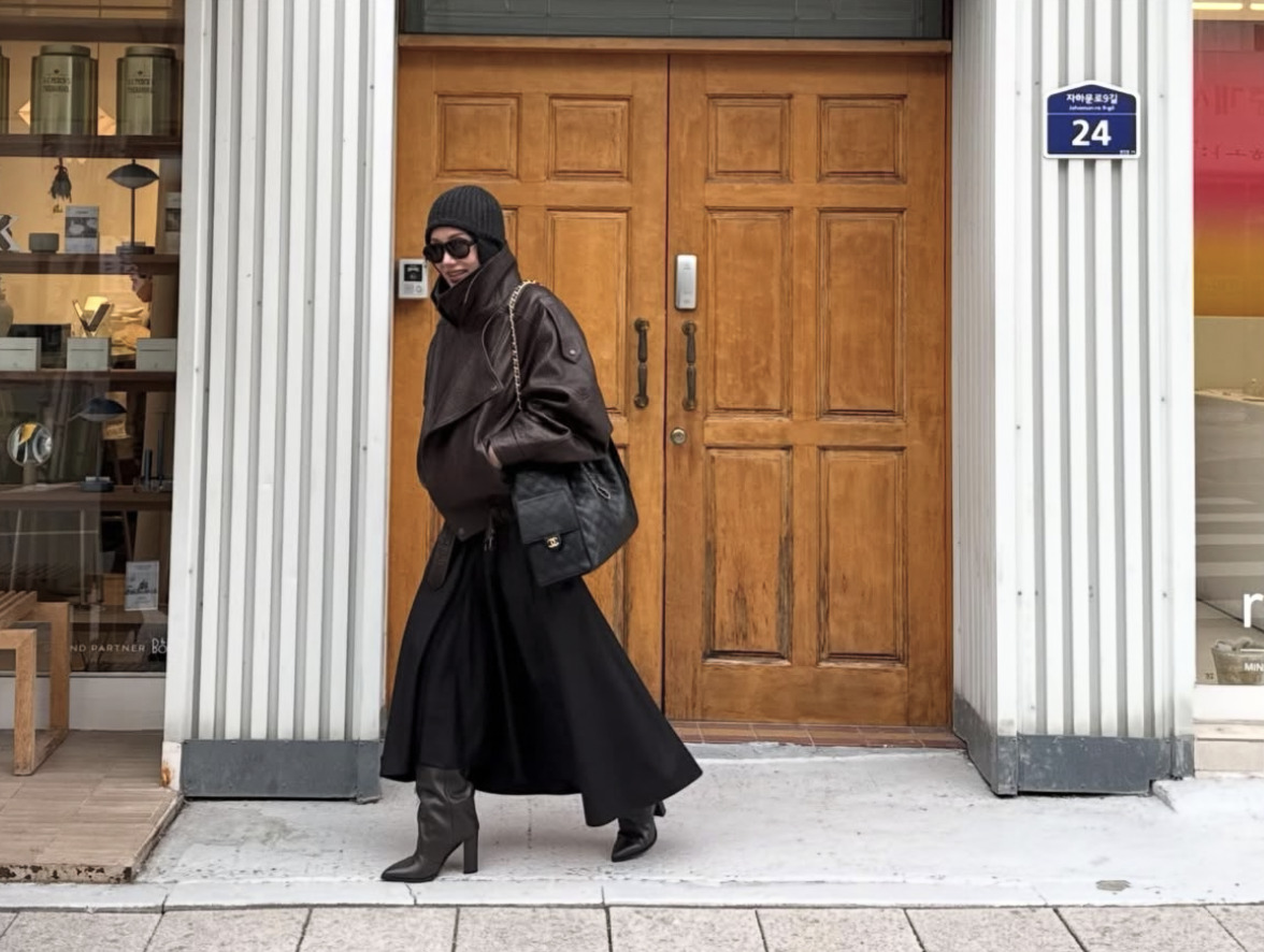 프렌치 시크 스타일링을 즐기는 엄정화도 이 디테일의 가죽 재킷을 자주 입는 편입니다. 특히 생 로랑의 이 재킷이 유행을 하면서, 하이넥 스타일이 점점 디폴트로 자리 잡은 느낌도 없지 않아 있고요. 벌키한 아우터 아래로 우아하게 펄럭이는 맥시 스커트를 매치해 쿨하면서도 세련된 옷차림을 연출했습니다. 깃을 바짝 올려 얼굴이 작아보이는 효과까지 곁들여서요!