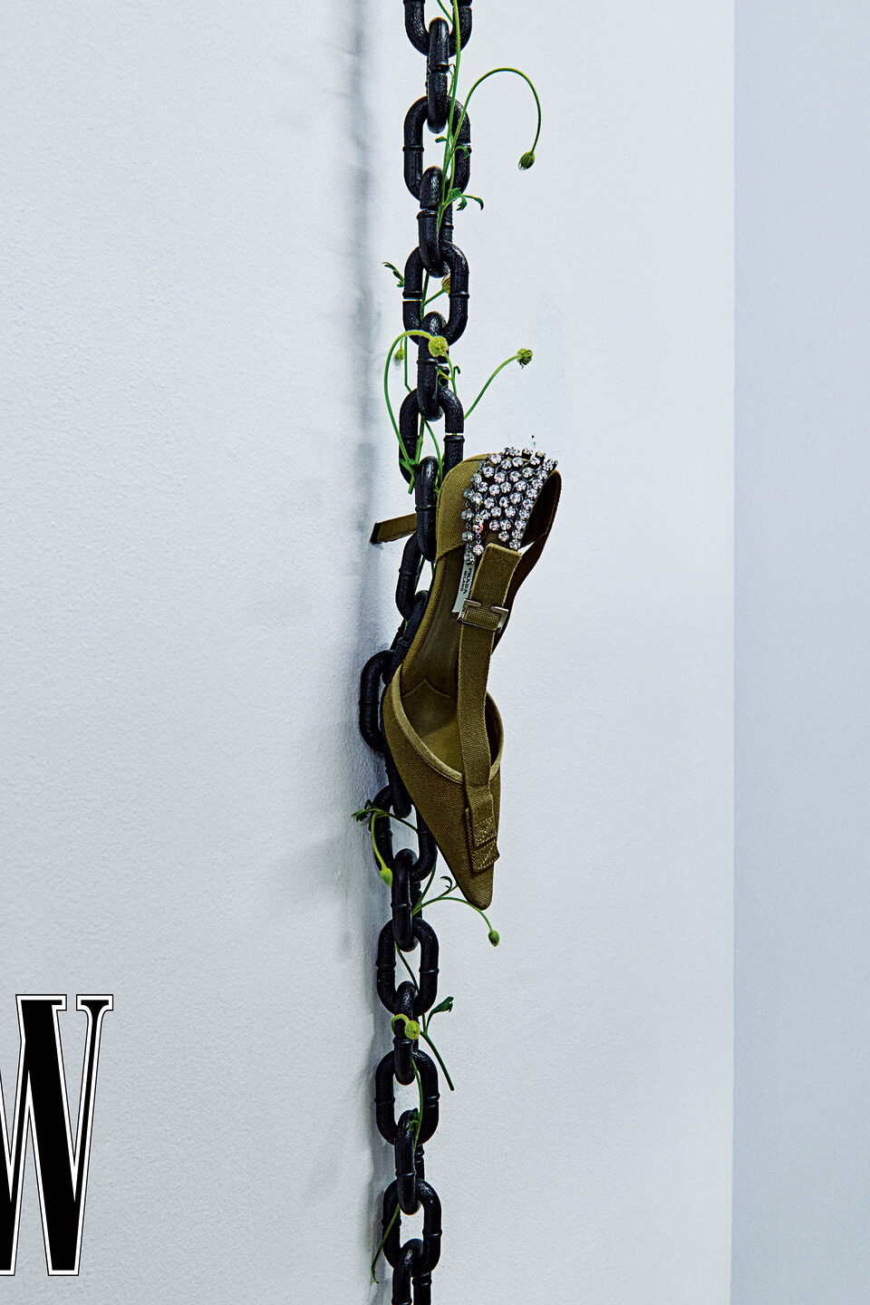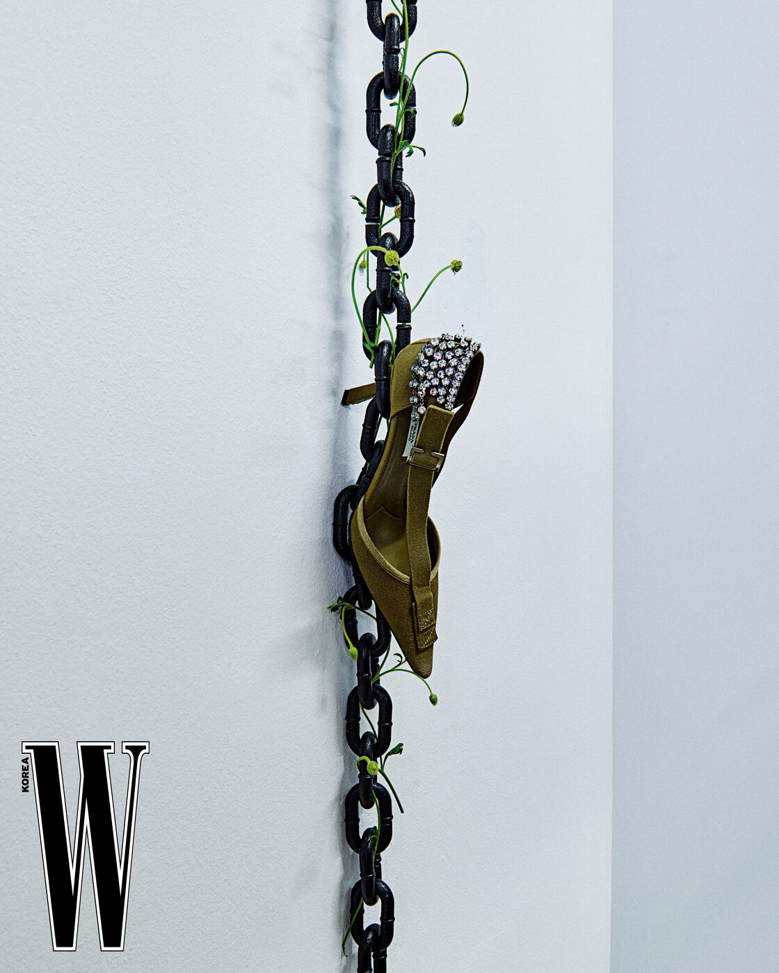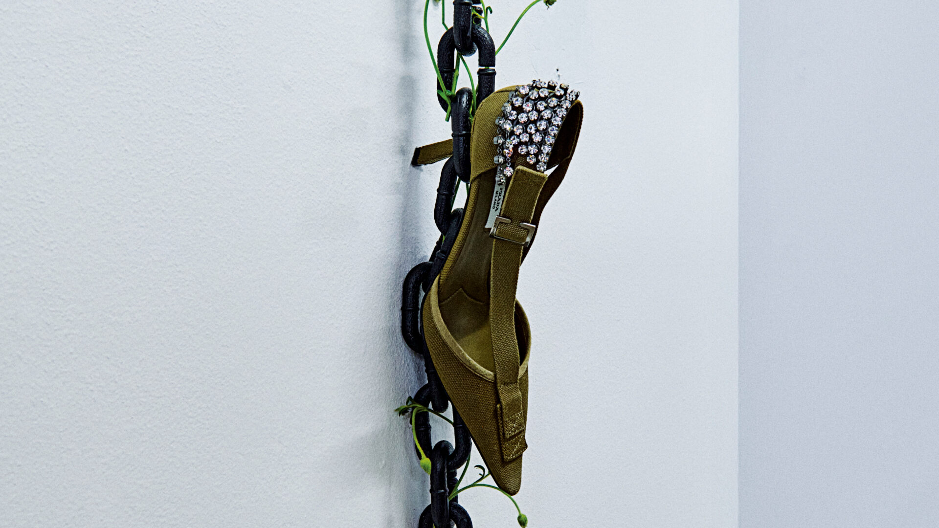 캔버스 소재에 주얼 장식을 더한 펌프스는 프라다 제품.