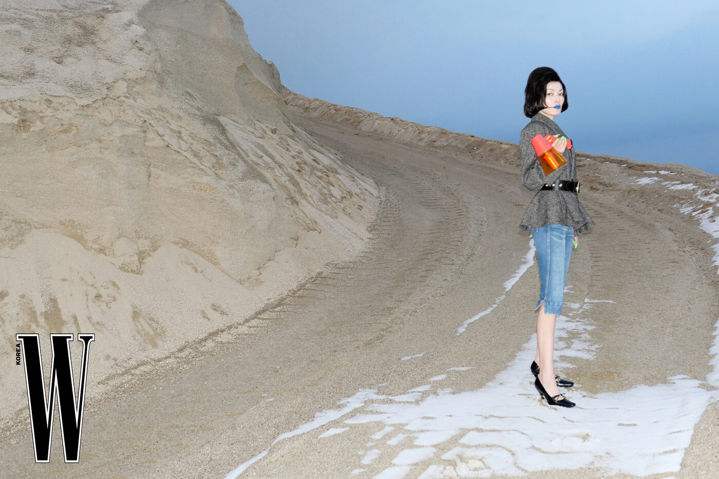 헤링본 재킷, 데님 쇼츠, 가죽 벨트는 Chloe, 힐은 Dior 제품.