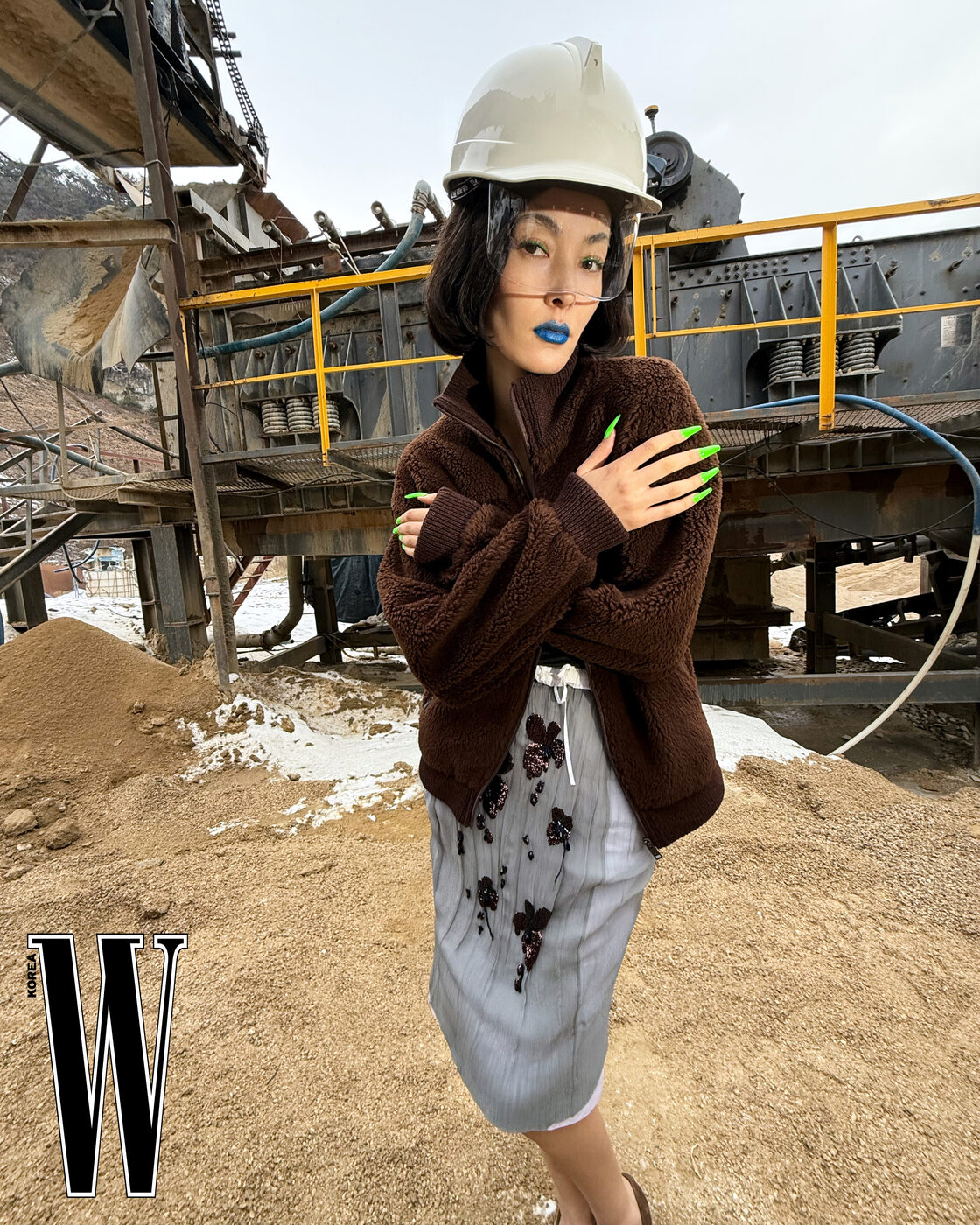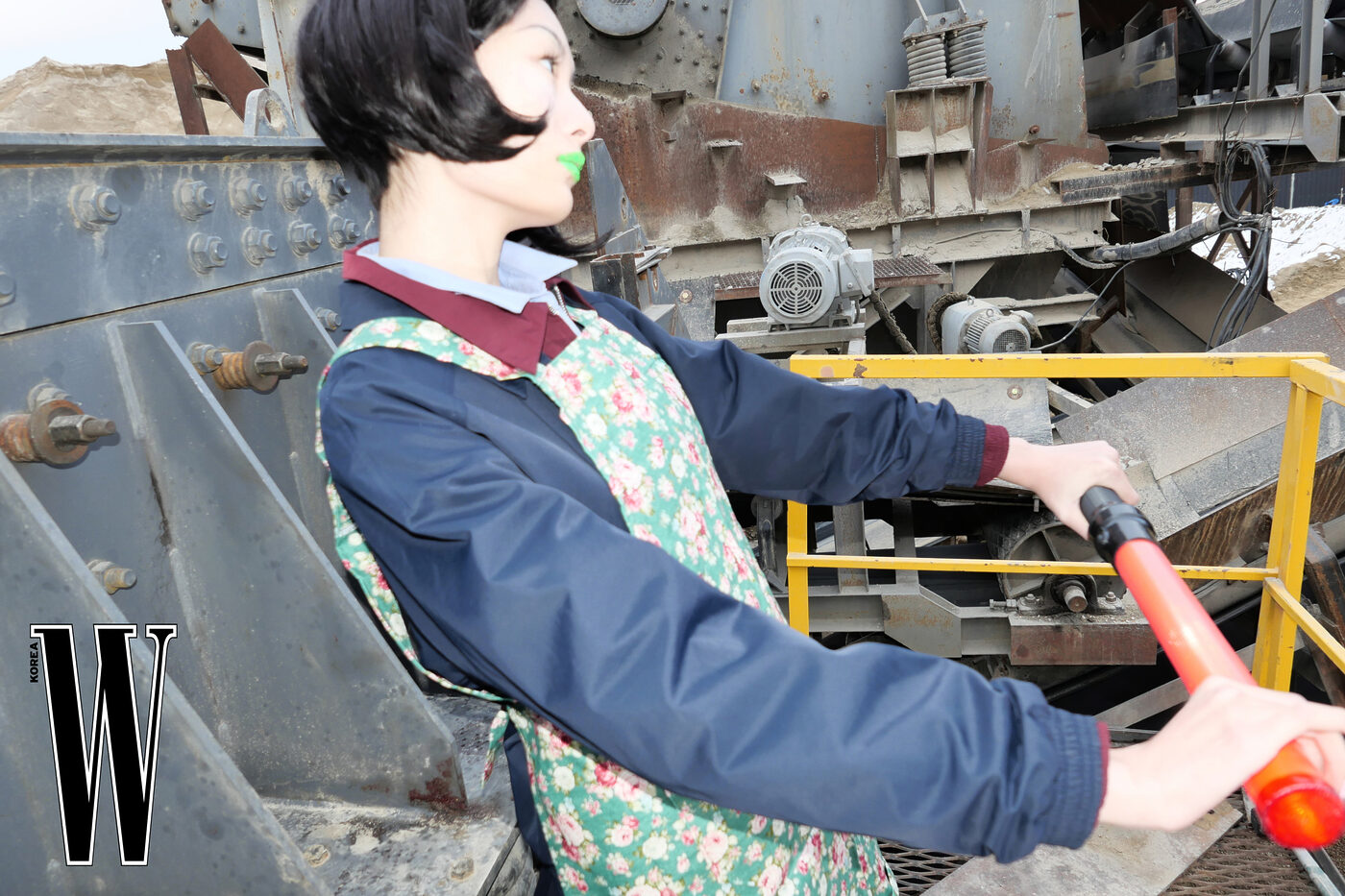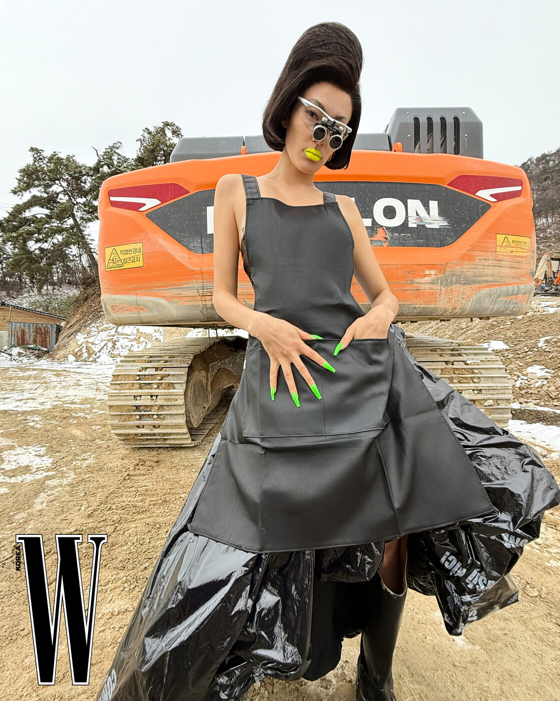 비닐 같은 질감의 풍성한 스커트는 Moschino, 부츠는 Balenciaga 제품.
