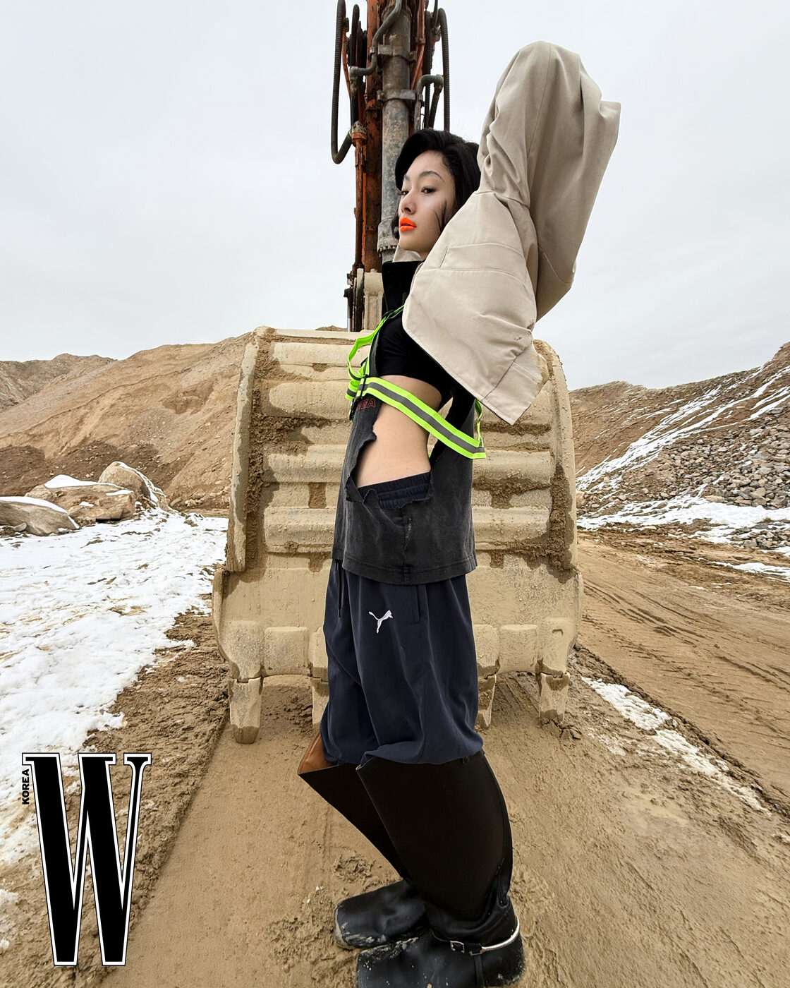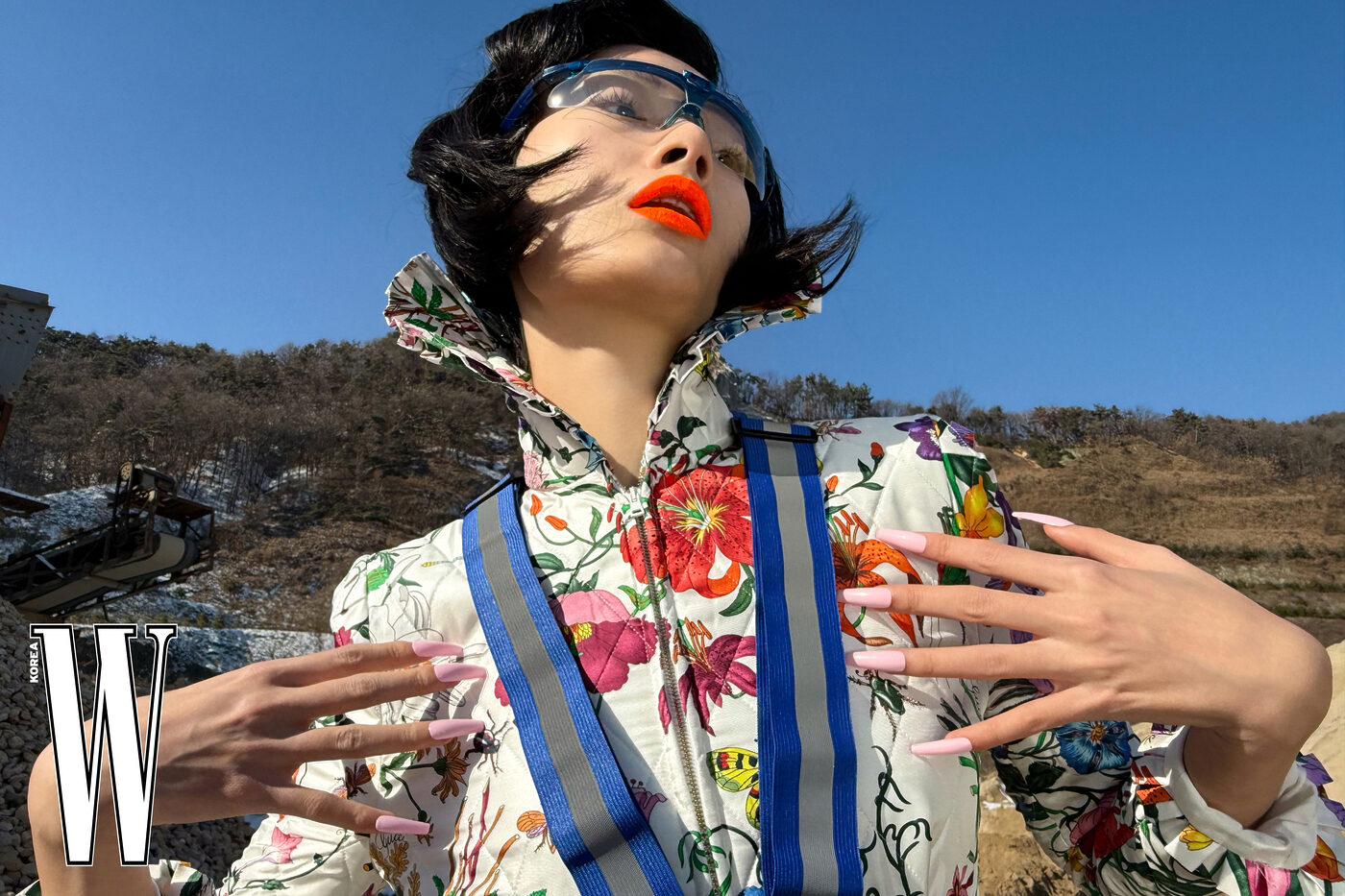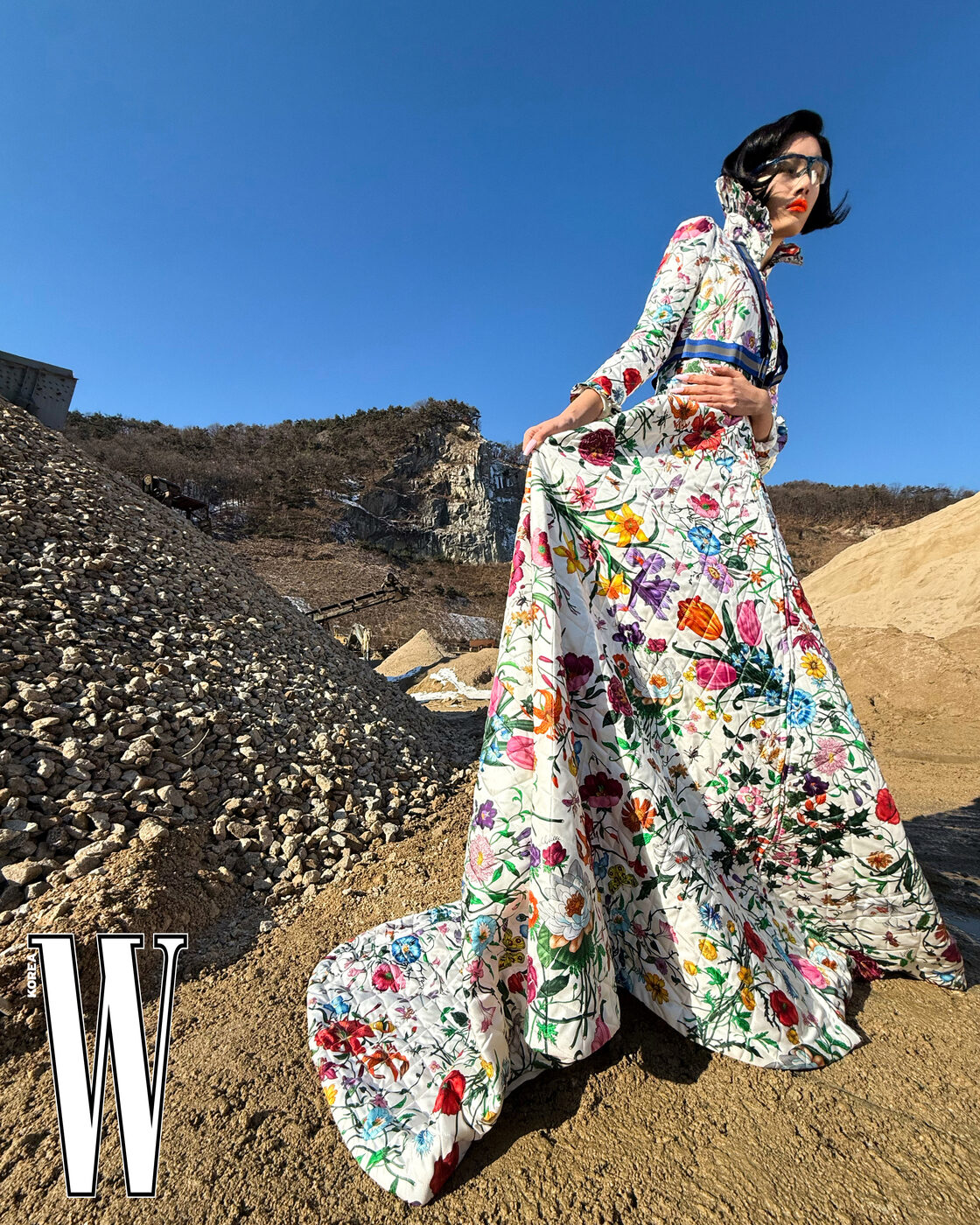 비닐 같은 질감의 풍성한 스커트는 Moschino, 부츠는 Balenciaga 제품.