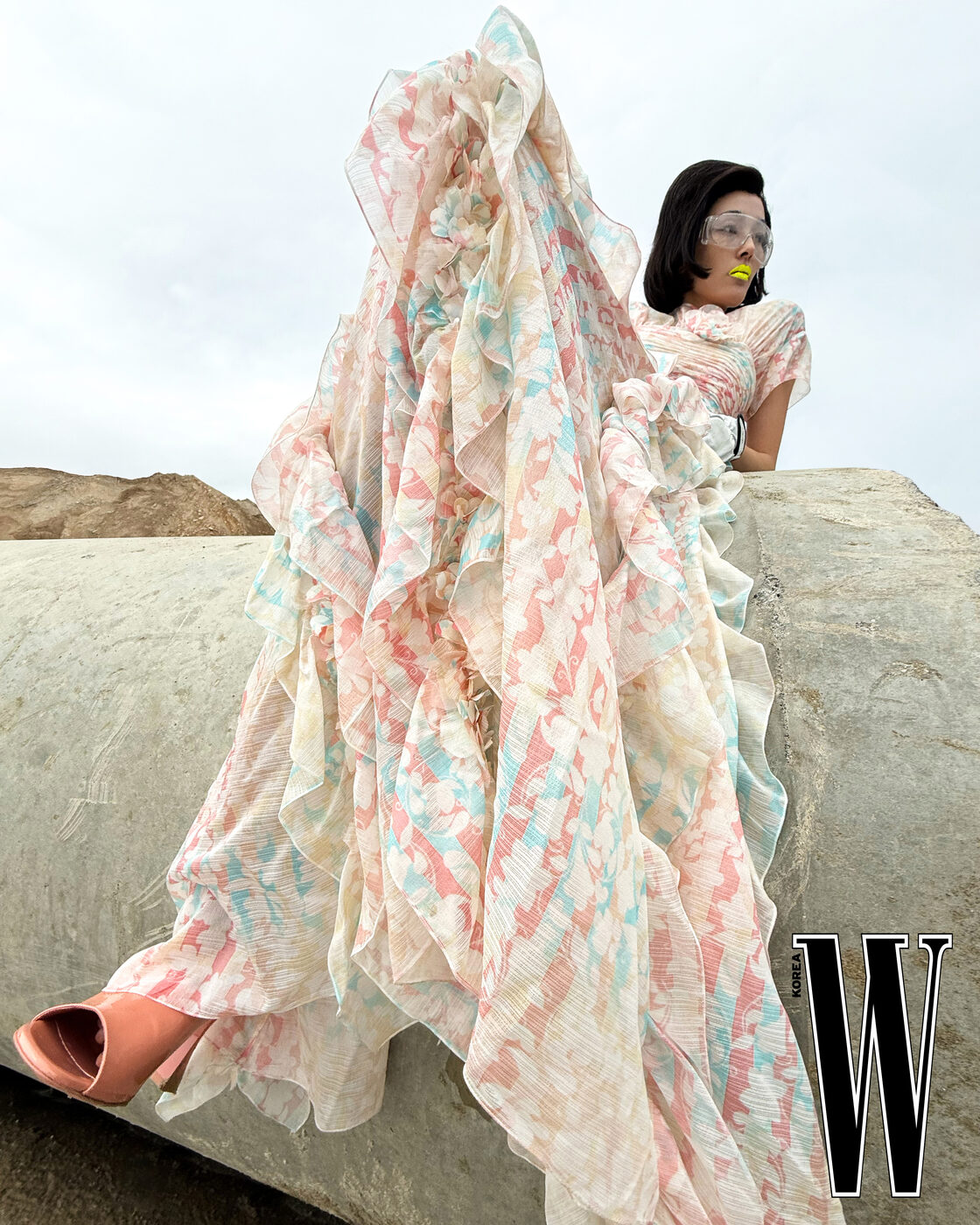 화사한 색감의 러플 드레스, 뮬은 Chanel 제품.