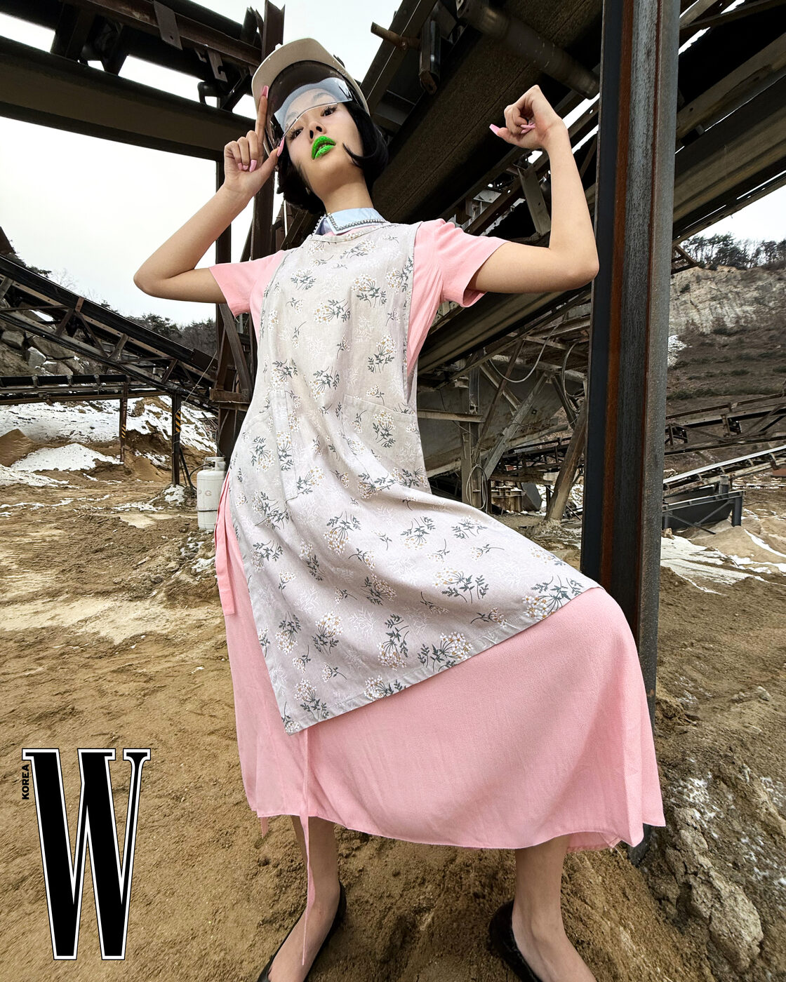칼라 장식 핑크색 드레스, 힐은 Prada 제품.