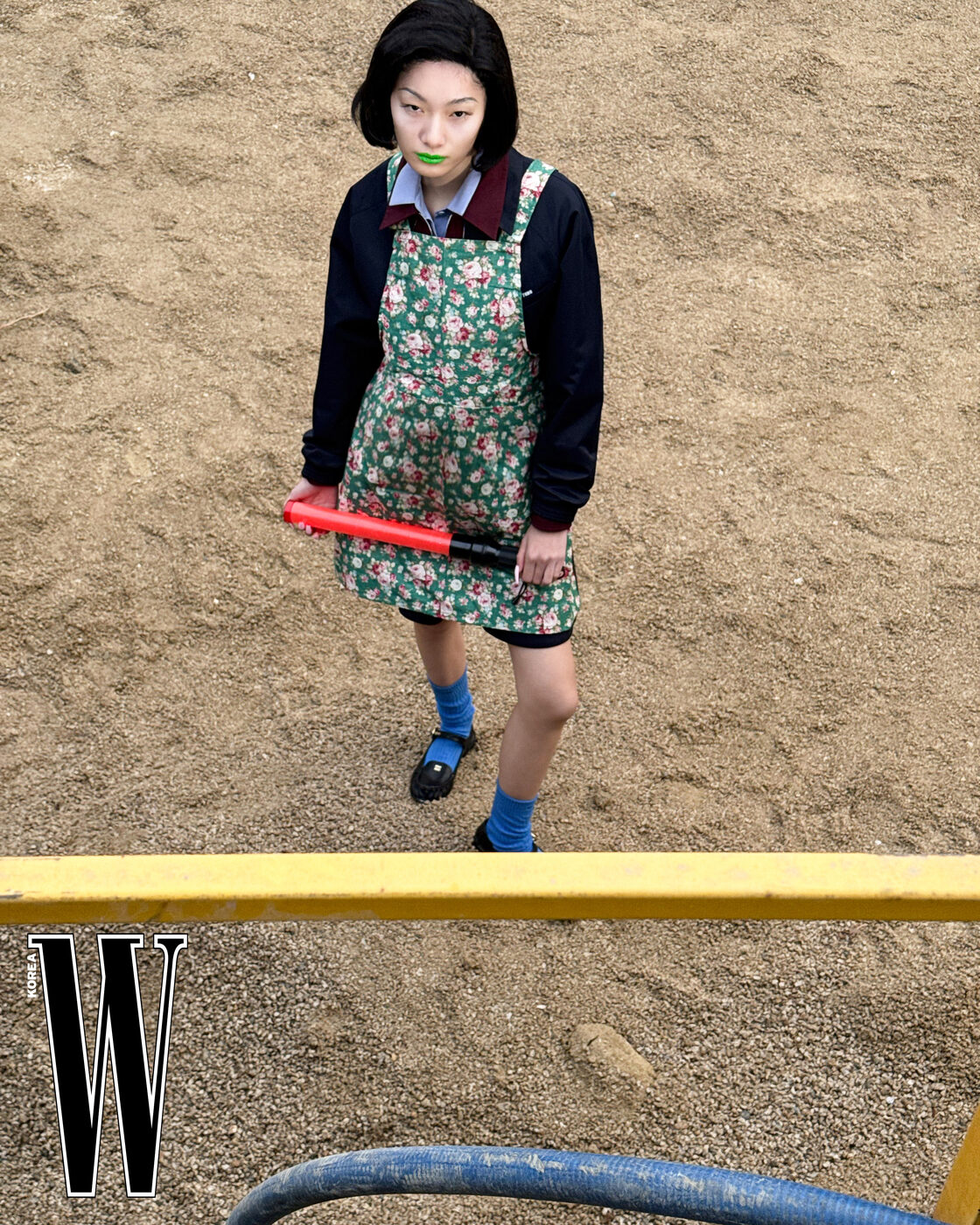 카디건, 코르셋 장식 톱, 레이스 칼라, 스커트, 니트 장갑, 삭스는 Shushu/Tong, 힐은 Prada 제품.
