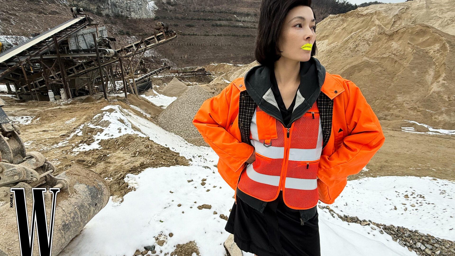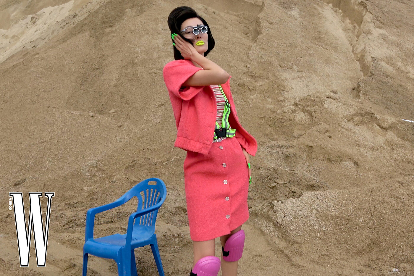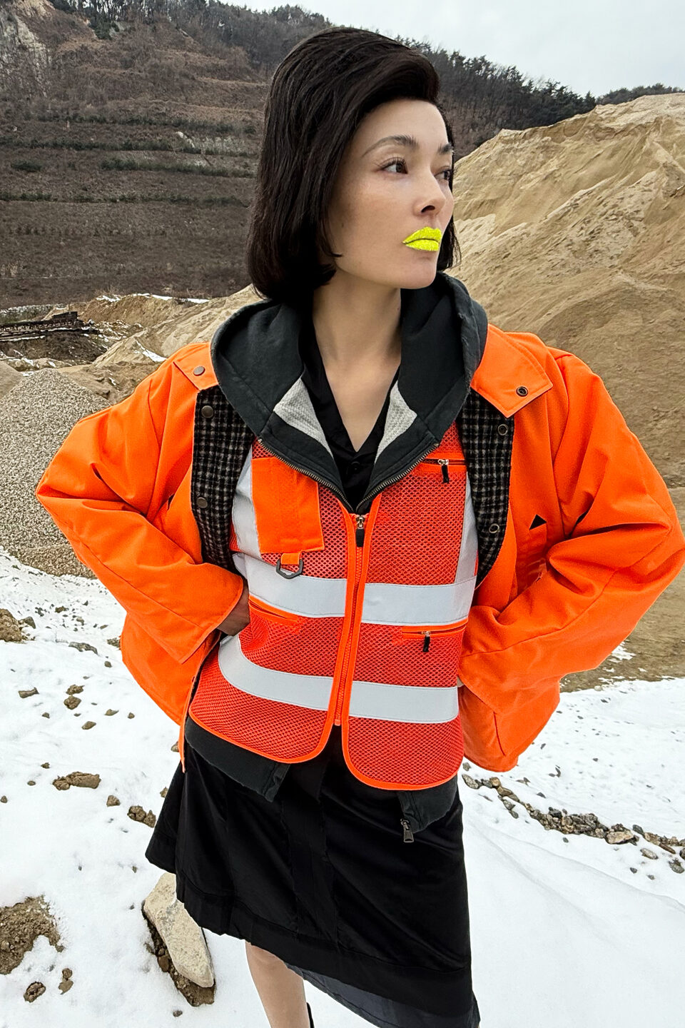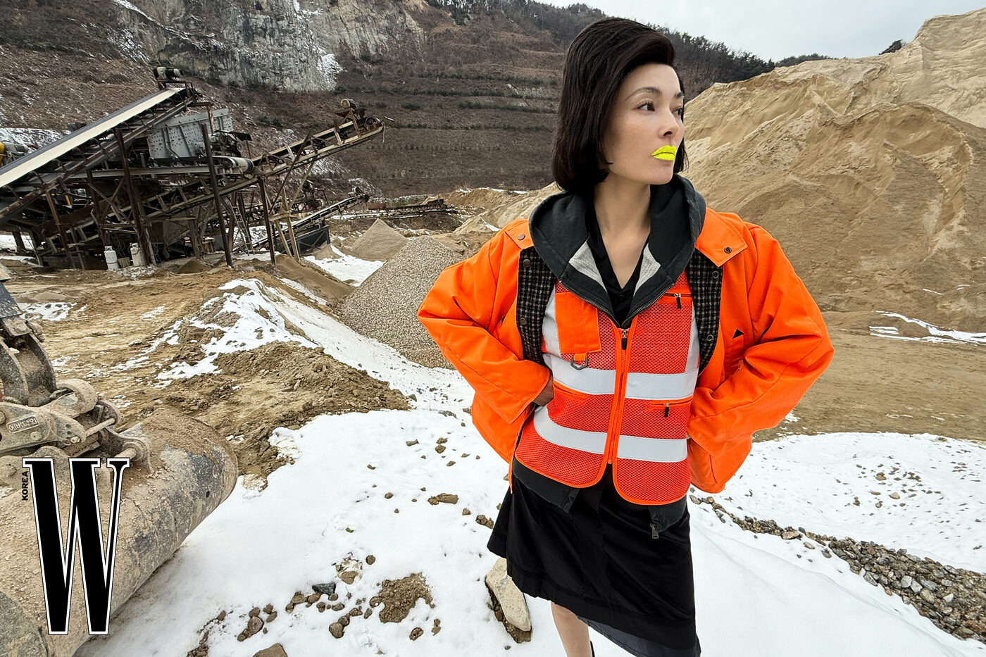 주황색 재킷, 스커트, 스웨트 재킷, 부츠는 Maison Margiela 제품.