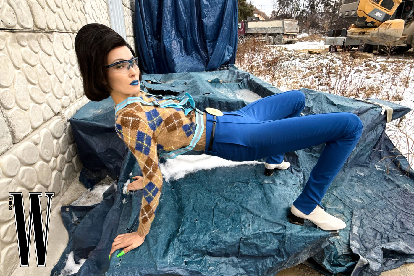 아가일 패턴 니트 톱, 스키니 팬츠, 벨트, 앵클부츠는 Celine 제품.