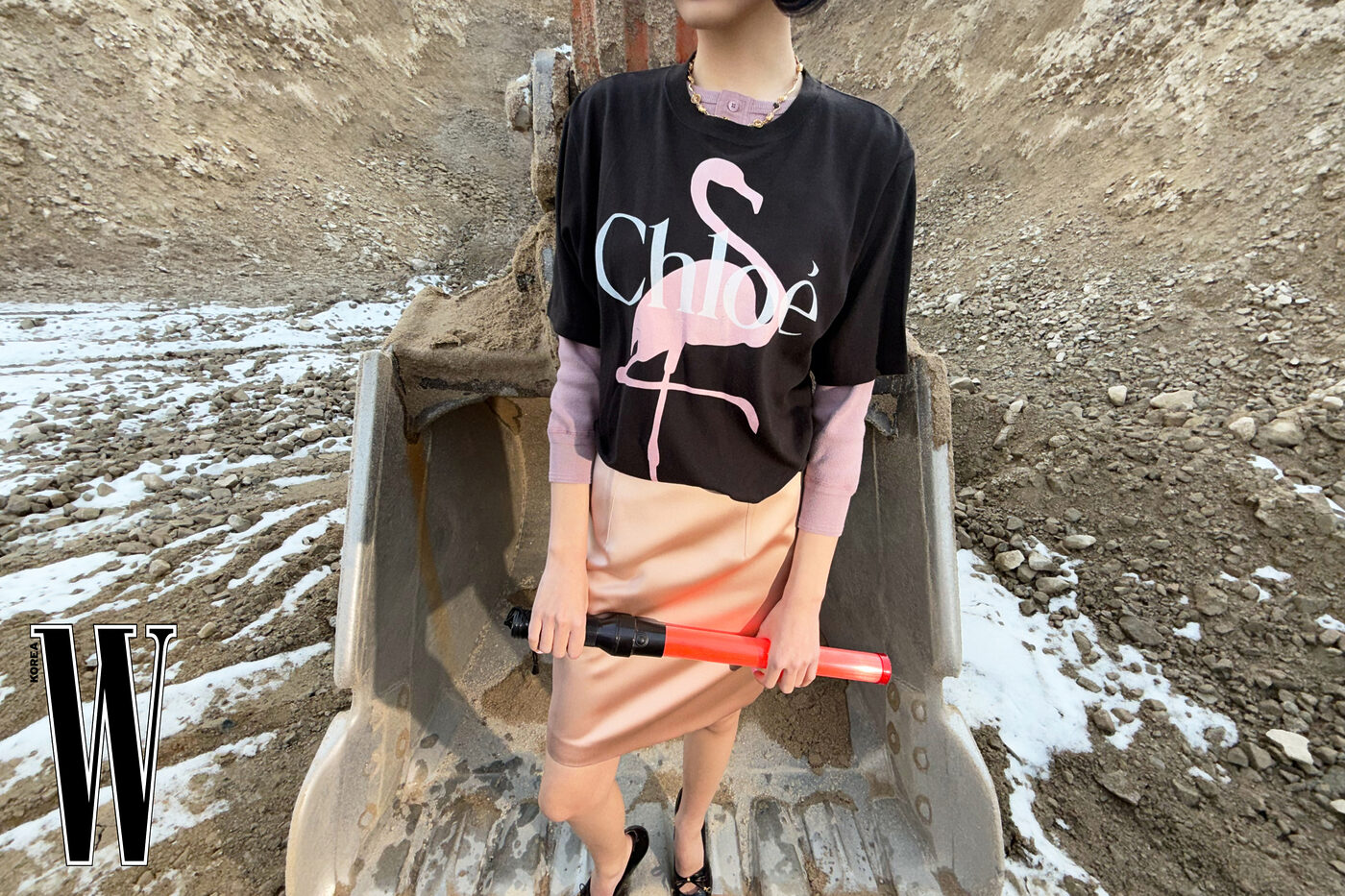 로고 장식 티셔츠, 버튼 장식 톱, 스커트, 네크리스는 Chloe, 힐은 Dior 제품.