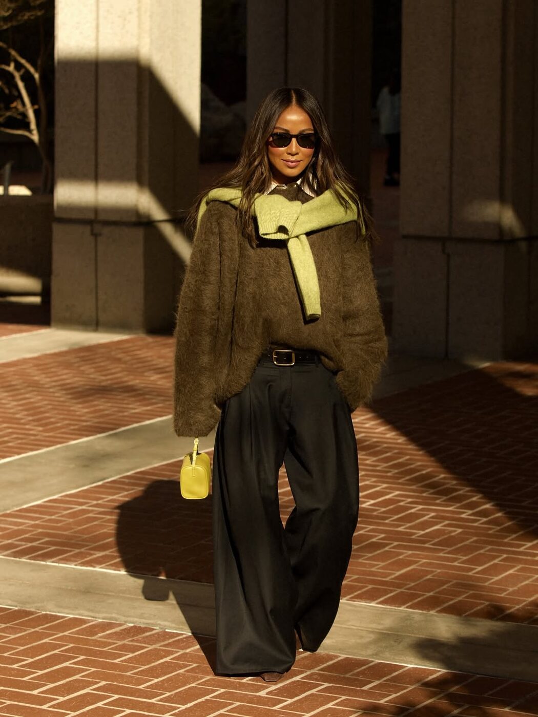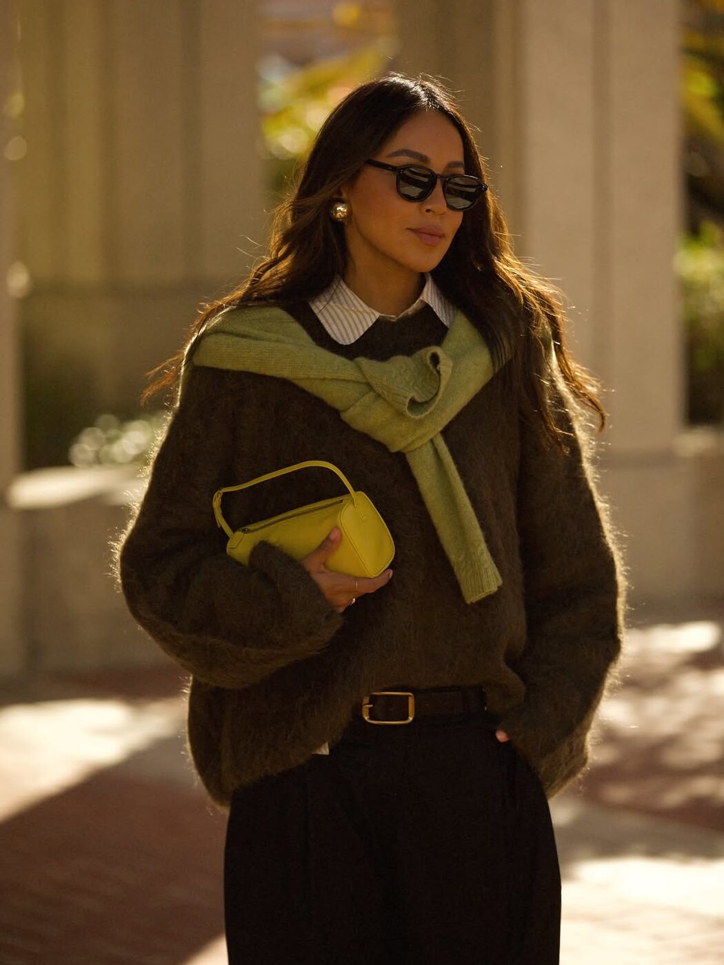 셔츠와 테일러드 재킷은 깔끔한 이미지가 필요한 순간마다 늘 훌륭한 효과를 발휘합니다. 각 잡힌 실루엣 때문에 다소 경직되어 보일까 우려된다면 포근한 소재의 니트 톱을 활용하세요. 귀여운 프린트나 패턴, 화사한 색감이 더해진 디자인을 골라 셔츠 위 레이어드하거나 재킷 안에 입으면 한층 더 부드러운 인상을 강조할 수 있을 거예요.