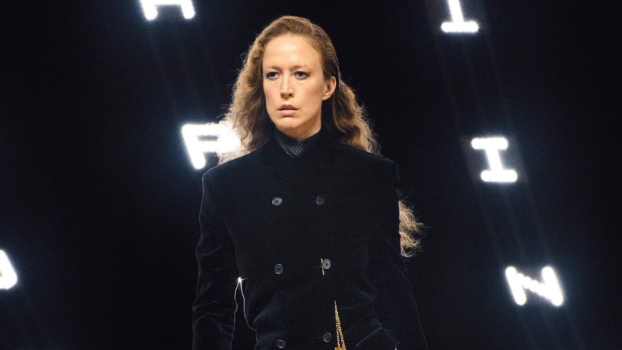 케이트의 무게감을 느끼게 한 또 하나의 요소는 오랜만에 컴백한 슈퍼모델 군단들. 2000년대를 풍미한 브라질 출신의 슈퍼모델 라켈 짐머만(Raquel Zimmermann)이 블랙 벨벳 더블 브레스트 코트를 입고 오프닝을 연 것에 이어 나타샤 폴리(Natasha Poly), 다우첸 크로스(Doutzen Kroes), 엘리제 크롬베즈(Elise Crombez) 등 한동안 런웨이에서 만나기 힘들었던 레전드 모델들이 무대에 올라 존재감을 뽐냈다. 컬렉션 전반부에 등장한 더블 브레스트 재킷과 코트는 다큐멘터리에서 시종일관 검은색 벨벳 케이프를 입고 등장하는 오손 웰즈 감독, 그리고 가짜 자서전을 통해 전쟁영웅으로 묘사된 하워드 휴즈(Howard Hughes)의 밀리터리 재킷을 떠오르게 했다. 캐서린 홀스타인은 밀리터리풍 프러그(Frog) 장식을 더한 재킷, 원피스, 블라우스를 통해 유니폼이 지닌 권위를 비틀어 표현했다. 이와 함께 고딕 스타일의 블랙 레이스 블라우스, 80년대 스타일의 러플 스커트 등을 믹스 매치했다. 한편, 미국 출신의 화가 밀턴 에이버리(Milton Avery)의 회화를 새틴 스커트에 프린트로 사용하며 ‘유일성을 담보로 하는 예술과 복제와 유통을 전제로 하는 패션의 경계’에 대한 질문도 다시 한번 던졌다. 블라우스 위에 놓인 원숭이 자수와 과장된 보타이는 사소한 유머처럼 보였지만, 〈거짓의 F〉의 한 장면을 직접 인용한 위트였다(클리포드 어빙이 어깨에 원숭이를 올리고 등장하는 장면이 나온다). 이밖에도 댄디한 남성복에서 영감을 받은 디테일은 케이트 특유의 강인한 분위기를 더욱 도드라지게 했고, 악어가죽 재킷과 벨벳 팬츠, 그레이 후드톱과 크록 팬츠의 조합처럼 정교하게 재단된 클래식 아이템을 스트리트 스타일과 믹스 매치한 유연함도 돋보였다.
