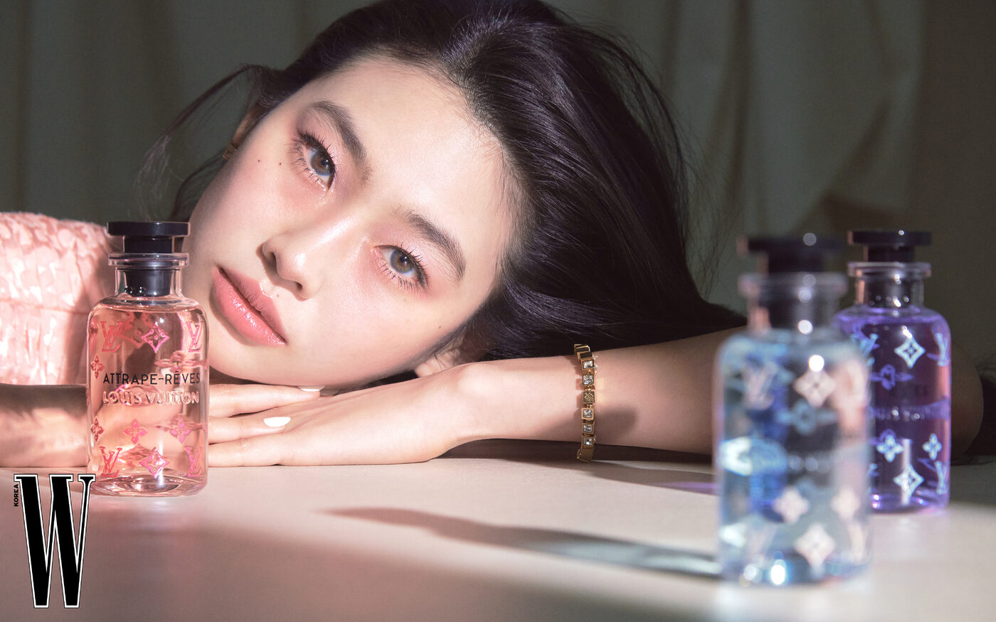 모노그램 탄생 130주년을 기념해 탄생한 향수 컬렉션과 함께 포즈를 취한 호연. 우아한 피오니와 거친 코코아 파우더, 파촐리와 리치 노트가 사랑스러운 핑크 보틀에 담긴 ‘모노그램 아트라프 레브’는 로맨틱하고 환상적인 무드로 루이 비통의 베스트셀러 향수 중 하나. 하우스의 헤리티지와 여행의 기술에서 영감 받은 하늘색 ‘모노그램 이마지나시옹’은 깊이 있는 앰버 노트에 블랙티, 시트러스가 어우러진 향으로, 세련되고 시크한 무드를 선사해 남성들에게 인기가 많다. 대담하고 모던한 플로럴 노트의 ‘모노그램 엘 루이 비통’은 은방울꽃과 암브록산, 파촐리가 따뜻하면서 관능적인 여운을 남기는 향. 모두 Louis Vuitton 제품.