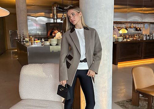 가죽 슬리브리스 톱, 스웨이드 스커트, 힐은 페라가모 제품.