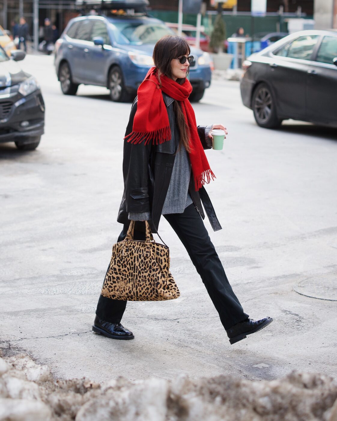 블랙 진은 미니멀한 스타일링을 즐기는 다코타 존슨의 오프듀티 룩에서도 자주 찾아볼 수 있는데요. 이날 역시 그녀가 사랑하는 슬림한 핏의 블랙 진을 꺼내 입었습니다. 군더더기 없이 떨어지는 라인 덕분에 블랙 진에는 어울리지 않는 상의가 없습니다. 기본 아이템을 더하면 세련미가 살아나고 반대로 통통 튀는 아이템은 든든하게 뒷받침 해주는 역할을 합니다. 레오파드 백, 빨간 머플러 같은 과감한 액세서리 역시 부담 없이 시도해볼 수 있고요.