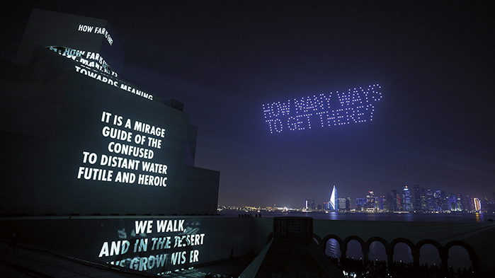그러나 단지 차갑게 지속 가능성을 저울질하기엔, 지난 나흘간 도하에 머물며 목도한 ‘예술적 순간들’의 잔상이 너무도 강렬하다. 특히 페어 전야, 이슬람미술관(MIA)에서 마주한 그 기묘한 ‘정적’을 잊을 수 없다. 페어의 시작을 알리는 성대한 웰컴 파티가 열린 그날, 수백 명의 아트피플은 고조된 음악 소리에 맞춰 치열하게 네트워킹을 이어가고 있었다. 그러다 일순 음악이 멈추고 새카만 도하의 밤하늘 위로 제니 홀저의 ‘Song’이 떠올랐다. 700대 이상의 드론이 두 시인 마흐무드 다르위시 (Mahmoud Darwish)와 누줌 알가넴(Nujoom Alghanem)의 시구를 밤하늘의 문장으로 수놓는 풍경 앞에서 사람들은 약속이라도 한 듯 침묵했다. 마치 세상이 멈춘 듯한 그 20분 동안만큼은 시장의 논리나 블루칩의 향방, 거래의 치열함 따위는 미미한 소음에 불과했다.