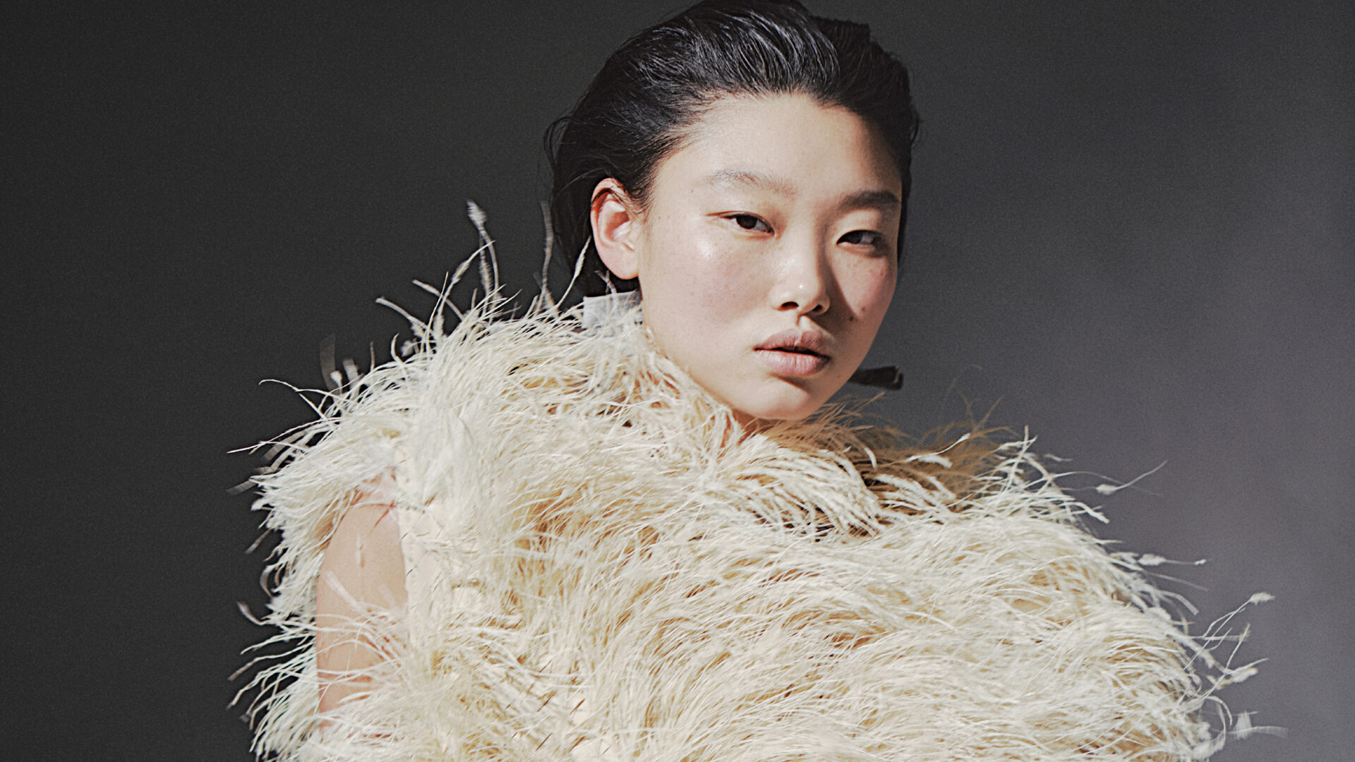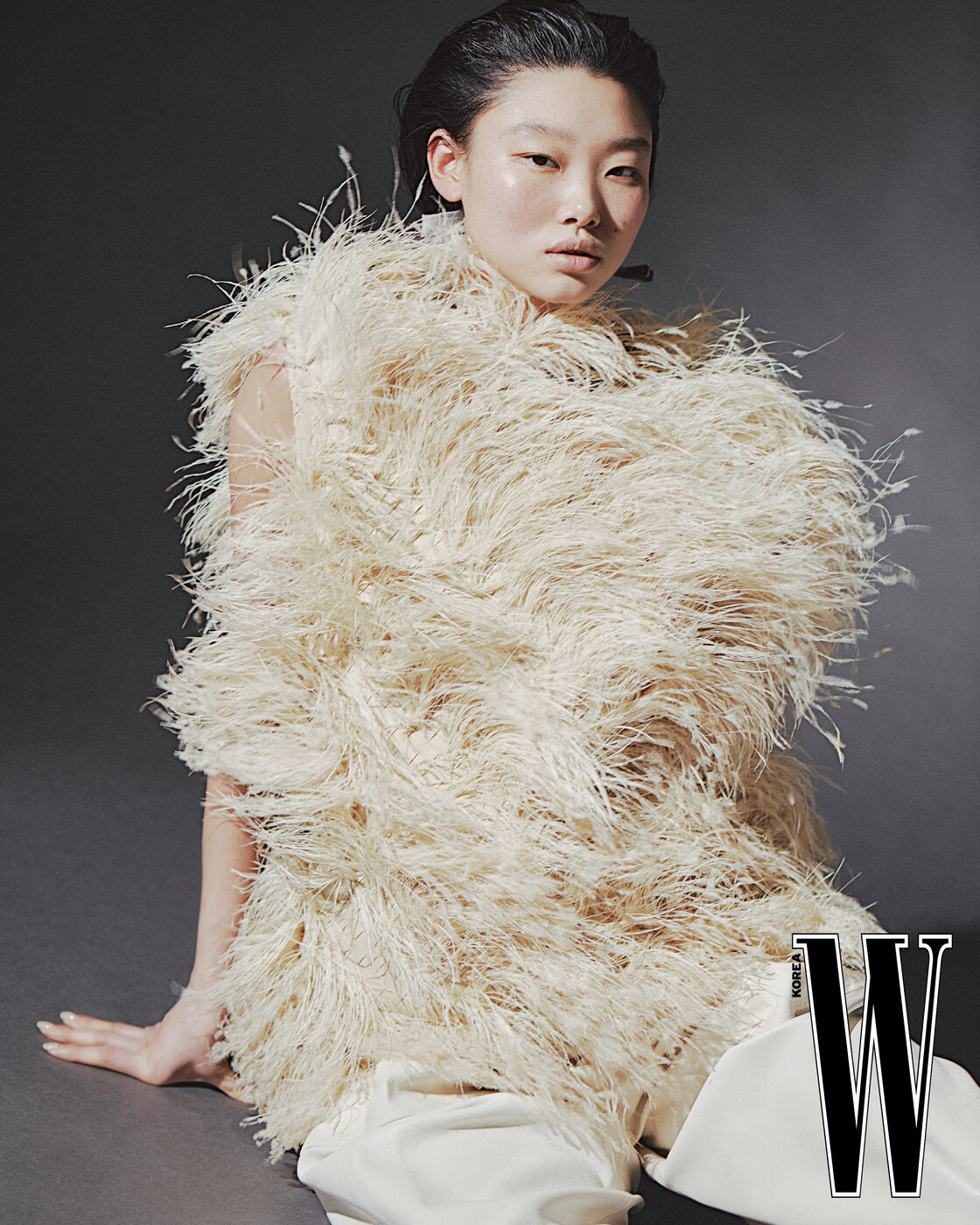 두 가지 타조 깃털을 인트레치아토로 엮은 가죽 톱과 코튼 개버딘 가죽 테이퍼드 트라우저는 Bottega Veneta 제품.