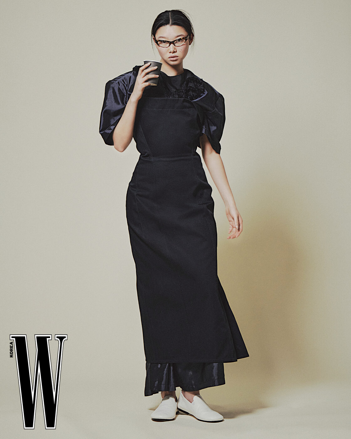 샤이니 테크 비스코스 트윌 드레스와 위에 덧입은 코튼 트윌 킥 드레스, 리사이클 아세테이트 소재의 캐츠아이 선글라스, 나파 가죽 슈즈는 Bottega Veneta 제품.