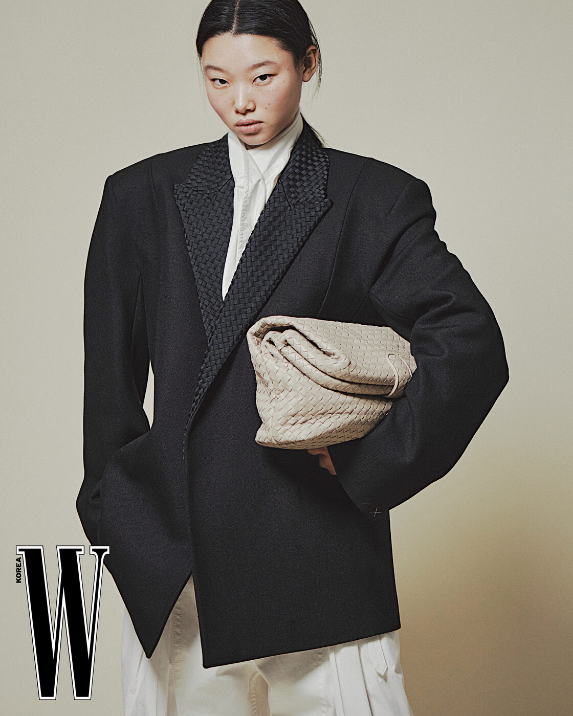라이트 나일론 실크 트윌 셔츠와 인트레치아토 라펠을 장식한 울 모헤어 캔버스 재킷, 코튼 포플린 테이퍼드 트라우저, 3D 나파 인트레치아토 디테일의 로렌 1980 백은 Bottega Veneta 제품.
