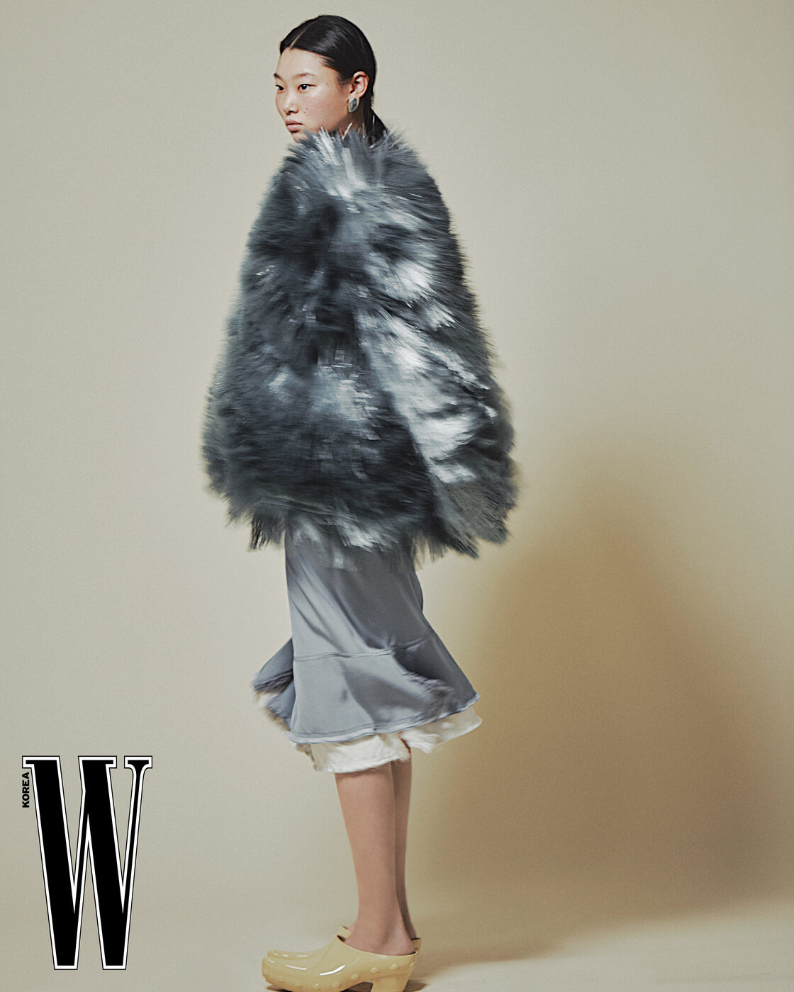 파이버 글라스 소재의 프린지 톱과 화이트와 블루 컬러의 워시드 파라슈트 스커트, 곤돌라 뮬 클로그, 글라스 스털링 실버 이어링은 Bottega Veneta 제품.