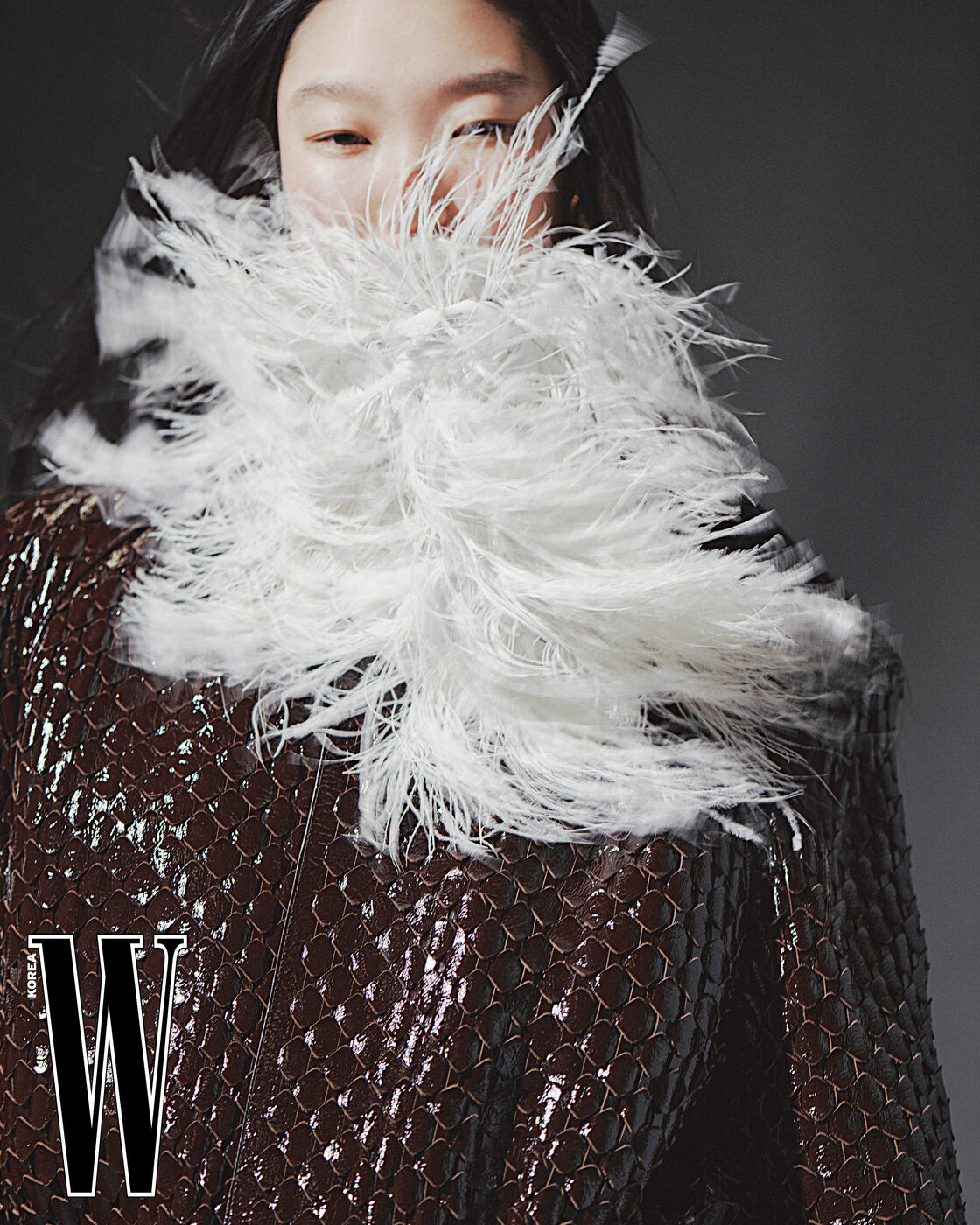 샤이니 스케일 인트레치아토 프런트 코트와 나파 & 깃털 스카프는 Bottega Veneta 제품.