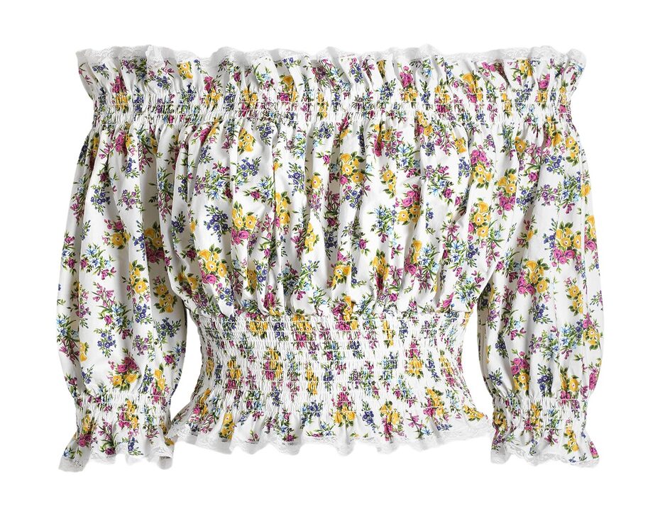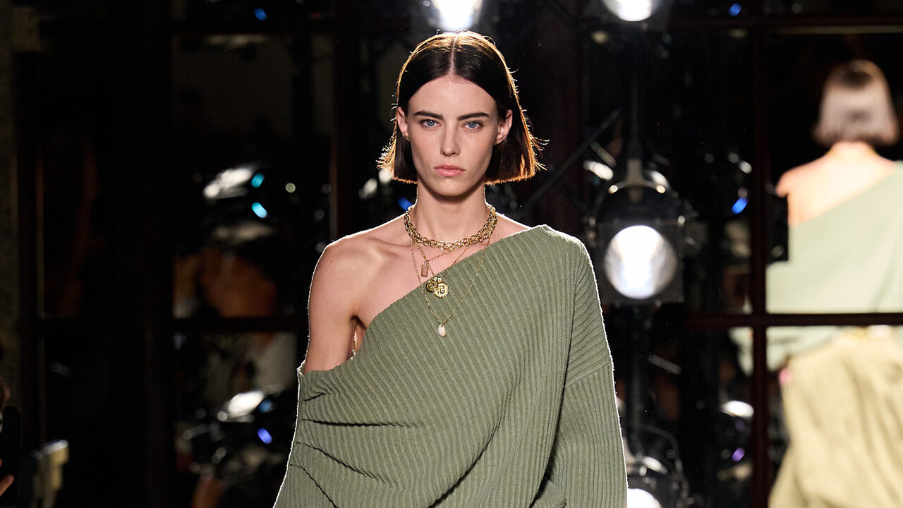 메종 마르지엘라는 마치 칼로 정교하게 선을 그어낸 듯 어깨 아래에서 반듯하게 끊어낸 오프숄더 룩을 선보였습니다. 한없이 정제돼 보이는 이 형태 뒤에 의외의 장치가 숨어 있었는데요. 시어하고 투명한 소재를 덧대 오프숄더의 구조를 섬세하게 지탱한 것이죠. 안쪽에는 비비드한 플라워 패턴의 슬리브리스 톱을 레이어드하고, 이너웨어의 끈은 일부러 숨기지 않았습니다. 오프숄더를 입을 때 가장 신경 쓰이는 요소인 속옷 끈을 감추기보다 스타일링의 일부로 연출한 선택이 인상적이었죠.