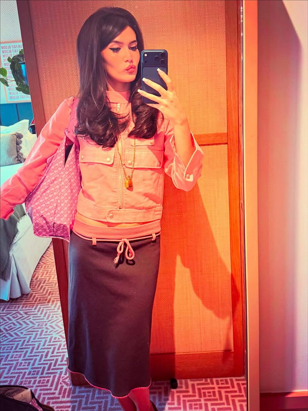 레트로한 바이브의 의상에 2:8 가르마와 풍성한 웨이브 헤어로 페미닌한 모습까지 갖춘 시에나. 물론 이 스타일링이 쉽게 나오는 것은 아닙니다. 무대를 준비하기 전의 모습 속 각종 헤어핀과 롤을 돌돌 말아올린 고충을 보여주는데요. 이 순간조차 사진으로 추억을 남기며 즐기는 귀여운 모습을 엿볼 수 있죠.