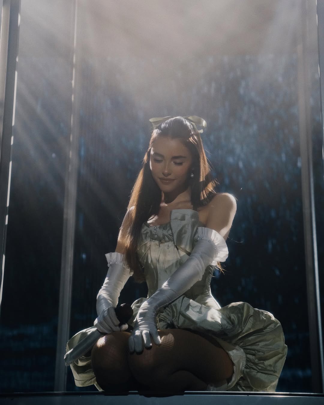 먼저 메디슨 비어의 무대 의상을 살펴볼까요? 그녀가 무대에 오를 때면 코르셋 디테일로 잘록한 허리선을 강조한 슬림한 톱에 러플이 풍성하게 더해진 티어드 미니스커트를 매치한 모습이 자주 포착됩니다. 실루엣을 극대화하는 구조적인 상의와 볼륨감 있는 하의의 대비가 핵심이죠. 여기에 레그 워머, 리본 헤어핀 등 발레 코어 무드가 짙게 묻어나는 아이템을 더해 러블리한 코케트 걸 스타일을 완성합니다.