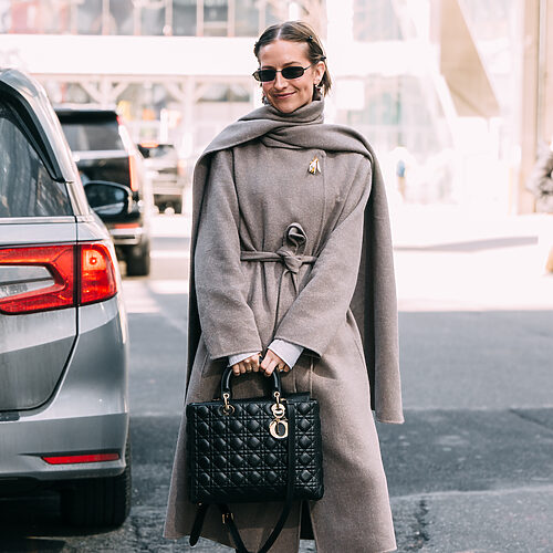 물론 여전히 흰 양말에 검정 구두의 조합 또한 유효합니다. 롱 블랙 코트를 입고 그 안에 화이트 톱과 흰 양말을 신어 블랙 앤 화이트의 미니멀한 조합을 완성했어요. 여기에 새파란 가방을 들어 포인트를 주었죠.