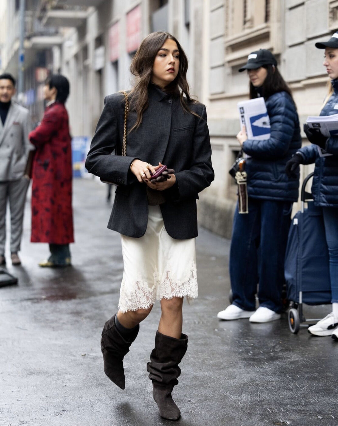 먼저 레이스 원피스를 살펴보죠. 이를 가장 쿨하게 소화하는 방법은 전혀 다른 재질의 아우터를 섞어주는 것입니다. 사진 속 룩처럼 하늘거리는 레이스 위로 툭 걸친 박시한 재킷이나 정교한 테일러드 코트는 이 아이템을 중성적이고 세련되게 눌러주죠. 섬세한 레이스 아래로 주름진 슬라우치 부츠도 무척 멋스럽군요