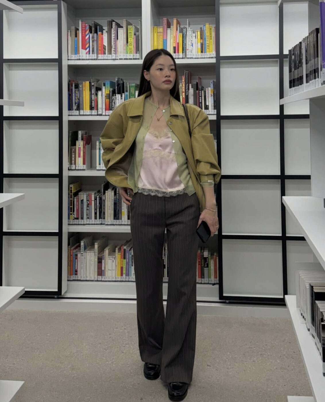 그리고 가장 눈여겨봐야 할 컬러 매치는 단연 싱그러운 그린과 사랑스러운 핑크의 만남입니다. 그리고 단순히 컬러를 섞는 것을 넘어, 아우터의 탄탄한 질감과 레이스의 섬세한 조직감이 대비를 이룰 때 비로소 룩의 완성도가 높아지죠. 가죽이나 두툼한 코튼 소재의 그린 재킷 아래로 핑크 레이스의 끝자락이 가볍게 겹쳐지게 연출해 보세요. 여기에 매니시한 핀스트라이프 팬츠를 더해 레이스가 가진 여성스러운 이미지를 중성적으로 비트는 것이 중요합니다.