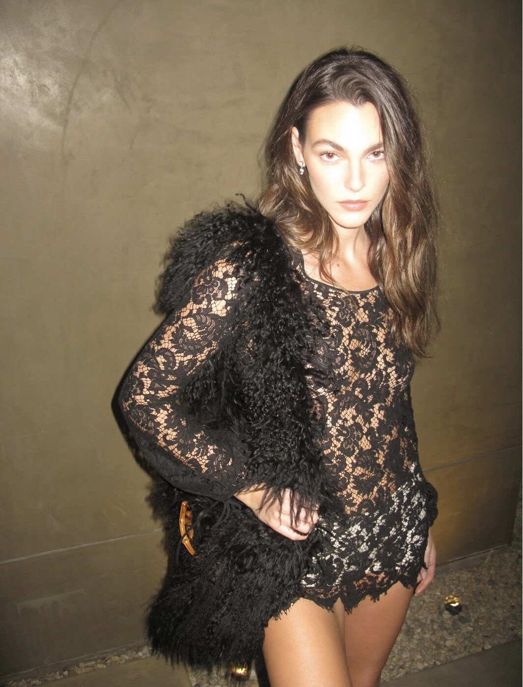 톱 모델 비토리아 세레티가 선보인 레이스 원피스 룩은 그야말로 레이스의 정석! 과감하게 비치는 실루엣이지만, 군더더기 없는 미니멀한 액세서리 매칭으로 오히려 고급스러운 느낌을 주죠. 특별한 날, 드레시해 보이고 싶다면 그녀처럼 실루엣을 강조한 올 레이스 룩에 도전해 보세요.