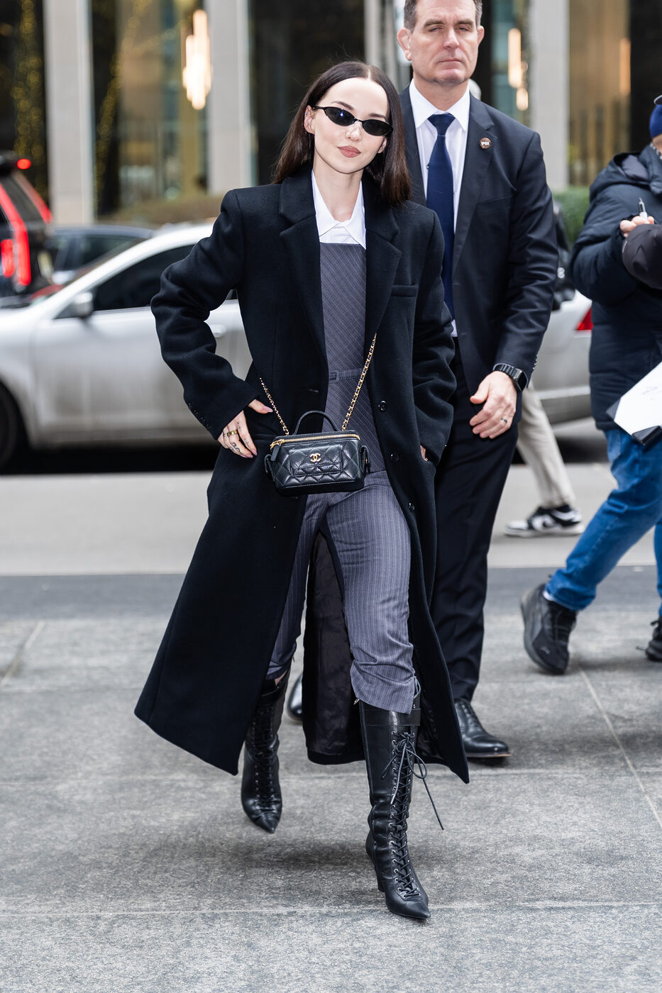 이번에도 화이트 셔츠로 깔끔한 비즈니스 우먼의 분위기를 이어갑니다. 베스트와 슬랙스 조합으로 세련된 카리스마를 보여줬죠. 보디라인을 정교하게 잡아주는 코르셋 스타일의 탱크톱, 카프리 팬츠로 디자인된 하의를 레이스업 부츠 안으로 집어넣어 실루엣을 정리했어요. 발끝으로 갈수록 좁아지는 스틸레토 쉐입의 슈즈를 선택해 더욱 날렵한 인상을 연출했습니다. 발목까지 오는 블랙 롱 코트에 그녀의 애착 백인 샤넬 배니티 백을 크로스로 매치해 클래식한 포인트를 더했네요.