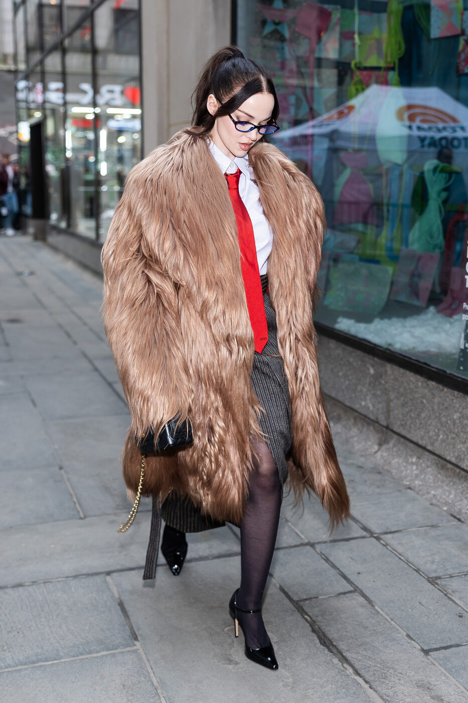 보스미를 잔뜩 뽐낸 브라운 퍼 코트 룩부터 살펴볼까요? 페라리의 2025 가을 컬렉션 룩으로 풀 착장을 완성한 도브 카메론. 가장 먼저 시선을 사로잡은 건 풍성한 텍스처의 브라운 퍼 코트였어요. 어깨선까지 넓게 퍼지는 라펠과 큼지막한 실루엣이 화려한 존재감을 자아냈죠. 코트 아래에는 긴 슬릿이 들어간 랩 스커트로 보디 라인을 답답하지 않게 드러내고, 새하얀 셔츠와 타이를 더해 균형을 맞췄습니다. 여기에 매끈한 광택이 도는 페이턴트 소재의 펌프스 힐로 마무리했죠.