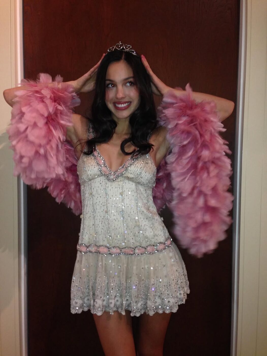 티아라를 쓰고 등장한 생일 주인공 올리비아 로드리고. 핑크와 실버 트리밍에 반짝이는 시퀸이 수 놓아진 매력적인 미니 드레스를 파티 룩으로 선택했습니다. 유려하게 흐르는 실루엣에 러플 모양의 밑단이 특징인 이 드레스는 무려 2004년 S/S 블루마린 제품인데요. 어쩌면 평소 빈티지한 의상을 즐겨 입는 그녀에게 딱 맞는 파티 드레스가 아니었을까요? 여기에 베이비핑크 컬러로 맞춘 숏 트렌치코트와 샌들 힐에 빈티지 샤넬 시퀸 백으로 러블리한 공주의 자태를 드러냈습니다.