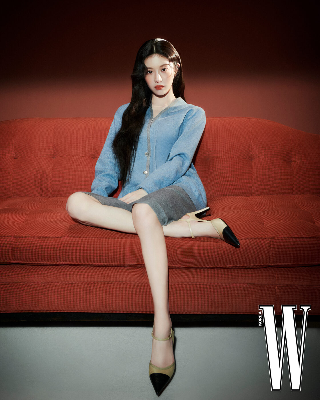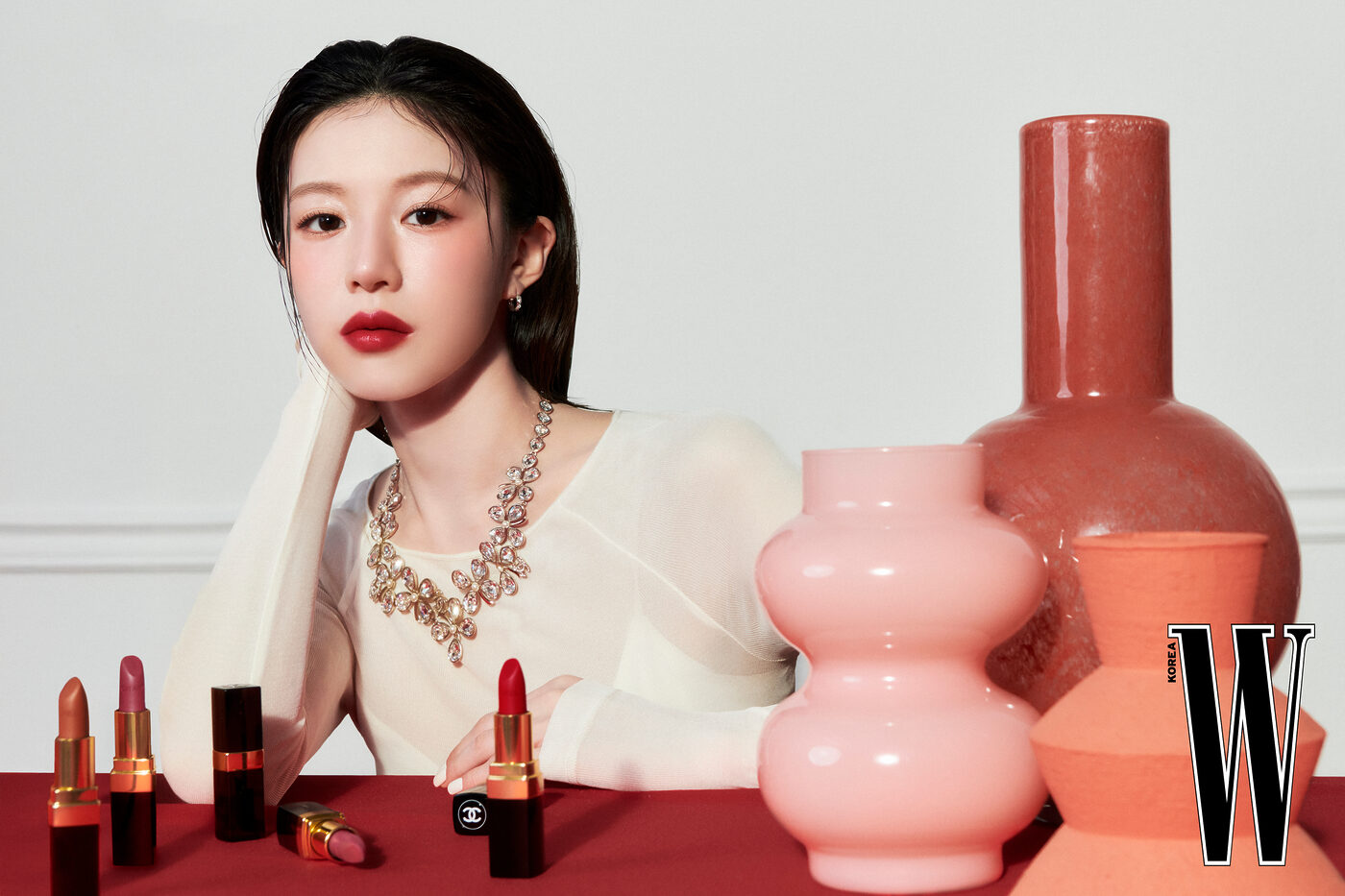은은한 반짝임으로 눈매를 밝혀주는 ‘옹브르 에쌍씨엘(234 베쥬 싸블르)’ 섀도를 눈두덩에 전체적으로 펴 바른 뒤, ‘바움 에쌍씨엘 글로우 스틱(트렌스페어런트)’을 더해 이슬처럼 촉촉한 눈망울을 완성했다. 볼에는 ‘N°1 DE CHANEL 레드 까멜리아 립 앤 치크 밤(1 레드 까멜리아)’을 전체적으로 가볍게 두드려 발라 홍조로 물든 듯 연출했다. 입술은 프레시한 레드 컬러의 ‘루쥬 코코 립스틱(118 뉴욕)’을 선명하게 바른 뒤, 외곽을 부드럽게 스머지해 자연스러우면서도 생기 넘치는 룩으로 마무리했다.