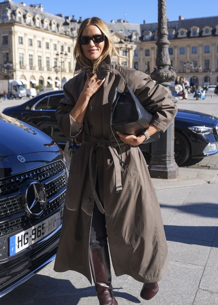 트렌치 코트 자락을 휘날리며 파리 리츠 호텔에 들어서는 로지 헌팅턴 휘틀리. 허리는 조여 매고, 소매는 자연스럽게 걷고, 깃은 세운 디테일이 옷차림에 힘을 더해줍니다. 옆구리에 낀 백을 든 애티튜드까지 모던하죠. 그녀가 애지중지 들고 있는 백은 바로 피비 파일로의 ‘스몰 킷 카바스’ 백. 정면에서 보면 직사각형으로 탄탄하게 쉐입이 잡혀있는 백인데 백 양쪽에 길게 늘어트린 스트랩이 평범한 사각백의 지루함을 탈피시켜주는 백이죠.