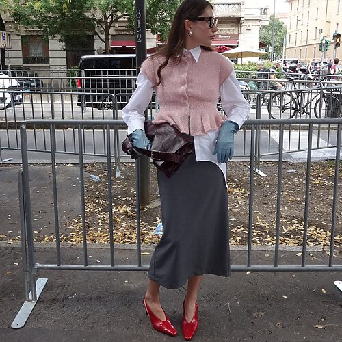 가장 기본인 블랙 앤 화이트도 셔츠의 형태에 따라 분위기가 확 바뀝니다. 니트 소매 끝으로 셔츠의 긴 커프스가 나오게 연출하면 드레스업한 것 같은 우아함을 줍니다. 선글라스 하나만 더하면 완벽한 시크 룩이죠.