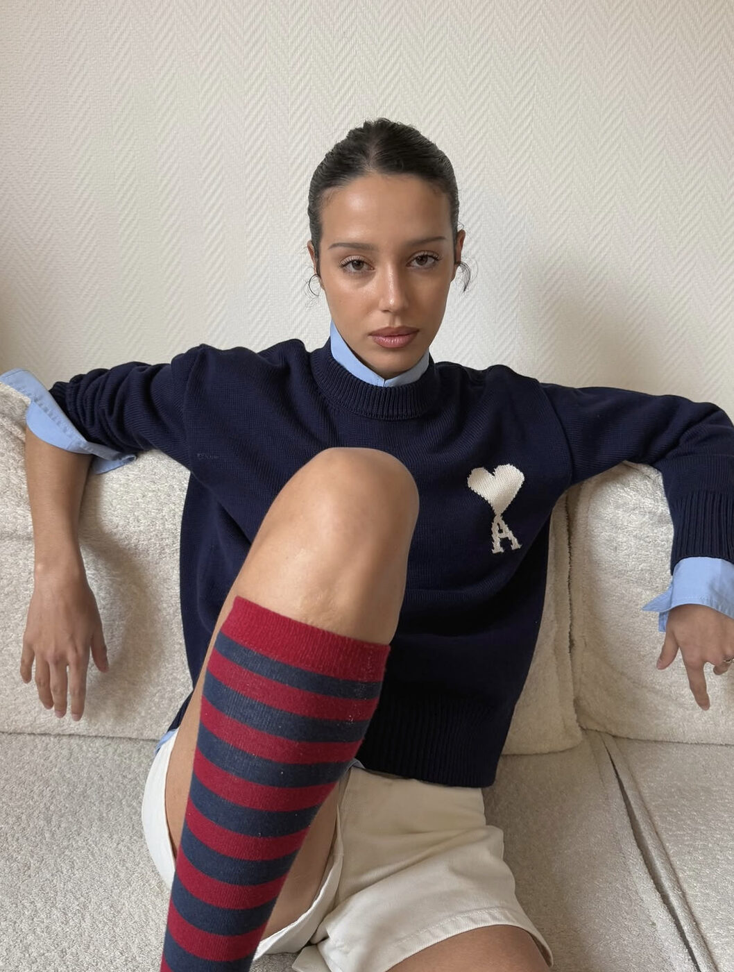 전체적으로 단정하게 입었다면, 양말에서 힘을 살짝 줘도 좋습니다. 레드 스트라이프 양말처럼, 윌리를 찾아서가 생각나기도 하지만요. 보이지 않는 곳이나 살짝 드러나는 곳에 강렬한 색을 섞으면 위트까지 장착할 수 있답니다.