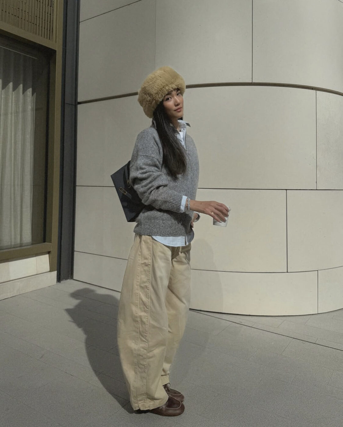 차분한 무드를 원한다면 톤온톤 매치가 정답입니다. 보송보송한 질감의 그레이 집업 니트 안에 스트라이프 셔츠를 레이어링해 보세요. 상의와 하의의 실루엣을 넉넉하게 가져가되, 셔츠의 밑단을 니트 아래로 살짝 보이게끔 해주면, 부해보이는 핏을 오히려 스타일리시하게 바꿔준답니다.